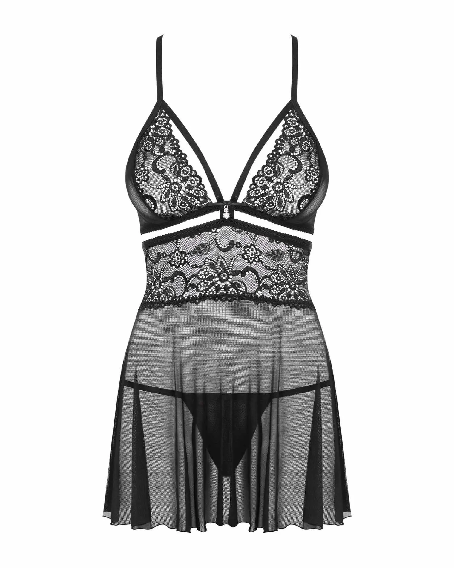 Wykonany z koronki i zwiewnej siateczki, ten babydoll z pewnością zwróci uwagę. Jego rozcięcie pod biustem subtelnie podkreśla dekolt, a zmysłowe plecy są kusząco wyeksponowane, co dodaje całości wyrafinowanego charakteru. Dodatkowo, biżuteryjna ozdoba nadaje mu niepowtarzalnego stylu, który sprawia, że każda kobieta poczuje się w nim wyjątkowo.