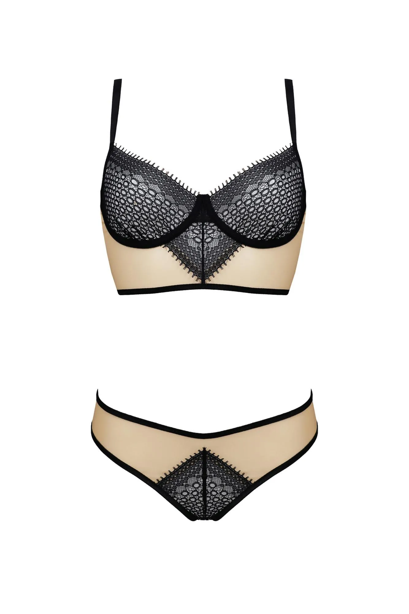 Przedstawiamy komplet Bielizna DENERYS w eleganckim odcieniu beżowym, który łączy w sobie lekkość tiulu oraz subtelność czarnej koronki. Ten zmysłowy zestaw został zaprojektowany z myślą o kobietach ceniących sobie komfort oraz elegancję, oferując jednocześnie idealne dopasowanie do sylwetki. Biustonosz z szerokim pasem oraz przedłużanym tyłem nie tylko modeluje sylwetkę, ale także zapewnia wygodę noszenia przez cały dzień.