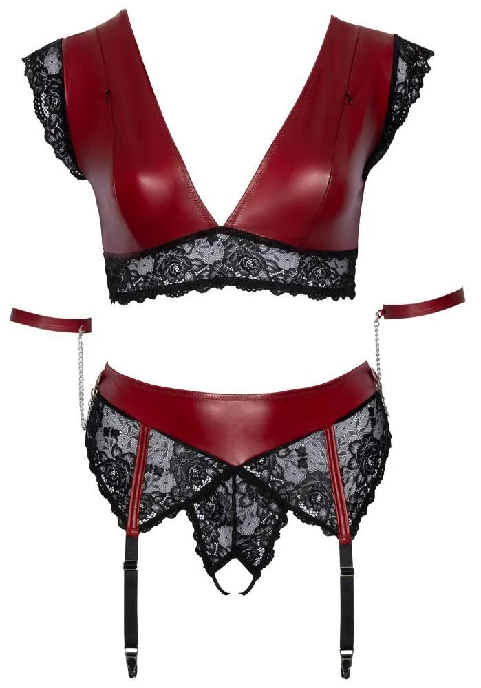 Bielizna erotyczna Cottelli BONDAGE PLUS to połączenie stylu i wyrafinowania w wyjątkowym zestawie, idealnym dla osób, które pragną dodać odrobinę zmysłowości do swojej garderoby. W skład kompletu wchodzi nisko wycięty bralette, regulowane stringi oraz dwa kajdanki na ręce, które razem tworzą idealny strój na wyjątkowe okazje. Wykonany z wysokiej jakości materiałów, zestaw dostępny jest w rozmiarze XL i wyróżnia się szlachetnym kolorem czerwonym, połączonym z delikatną czarną koronką oraz eleganckimi metalowymi detalami w kolorze srebrnym.