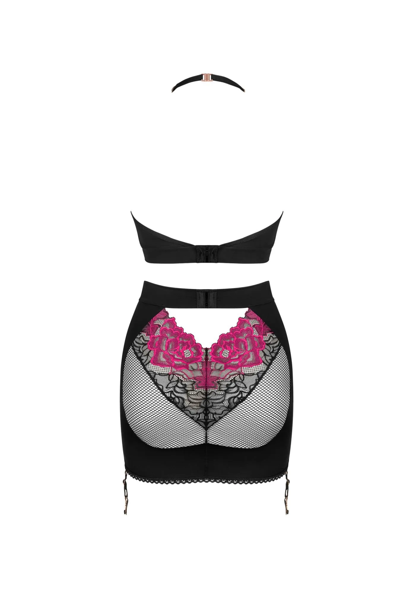 Komplet został wyposażony w regulowane ramiączka oraz kilkustopniowe zapięcie, co umożliwia idealne dopasowanie do sylwetki. Dodatkowo, odpinane paski do pończoch pozwalają na personalizację stylizacji, dzięki czemu możesz z łatwością uzyskać pożądany wygląd. Ramiączko na szyi podkreśla biust, dodając szczyptę wdzięku każdej stylizacji. Całość dopełniają dodatki w kolorze różowego złota, które wspaniale harmonizują z całością.