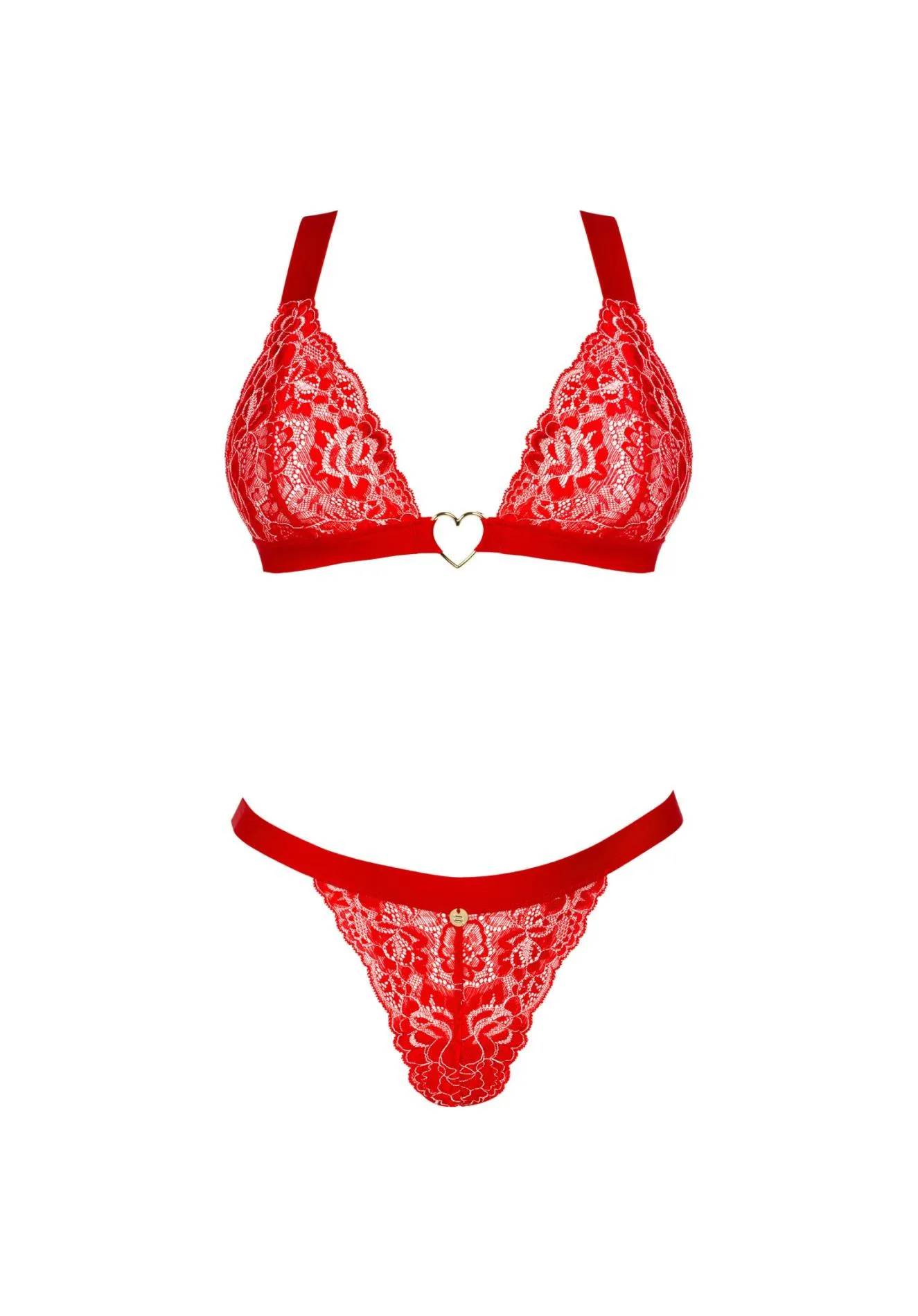 Warto zwrócić uwagę na metalowy łącznik w kształcie złotego serca, który stanowi intrygujący detal, nadając całości unikalnego charakteru. Subtelna błyszcząca zawieszka doskonale dopełnia ten zmysłowy komplet, a przyjemny w dotyku materiał sprawia, że bielizna jest nie tylko piękna, ale i komfortowa w użytkowaniu. Pozwól sobie na odrobinę luksusu i zachwycaj swoim stylem w każdej sytuacji.