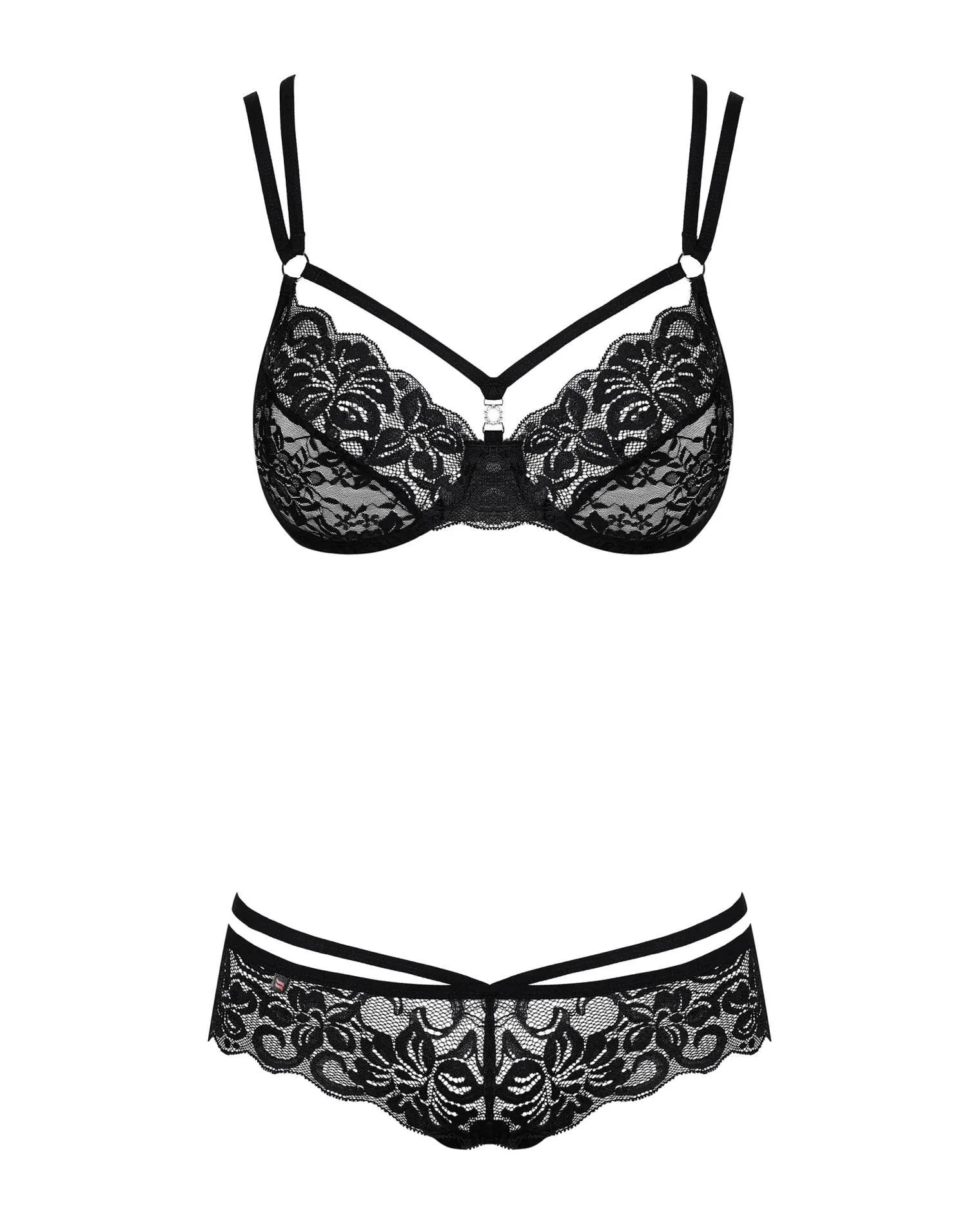 Komplet składa się z dwóch elementów: biustonosza oraz koronkowych stringów, które idealnie współgrają ze sobą. Biustonosz wyposażony jest w regulowane ramiączka oraz zapięcie typu Did2Fit, co zapewnia doskonałe dopasowanie. Miseczki z fiszbinami i podwójne ramiączka uwydatniają kształty, gwarantując efektowny wygląd. Dodatkowo, biżuteryjne wstawki oraz ozdobne kółeczka, które są wolne od niklu, dodają całości subtelnego blasku.