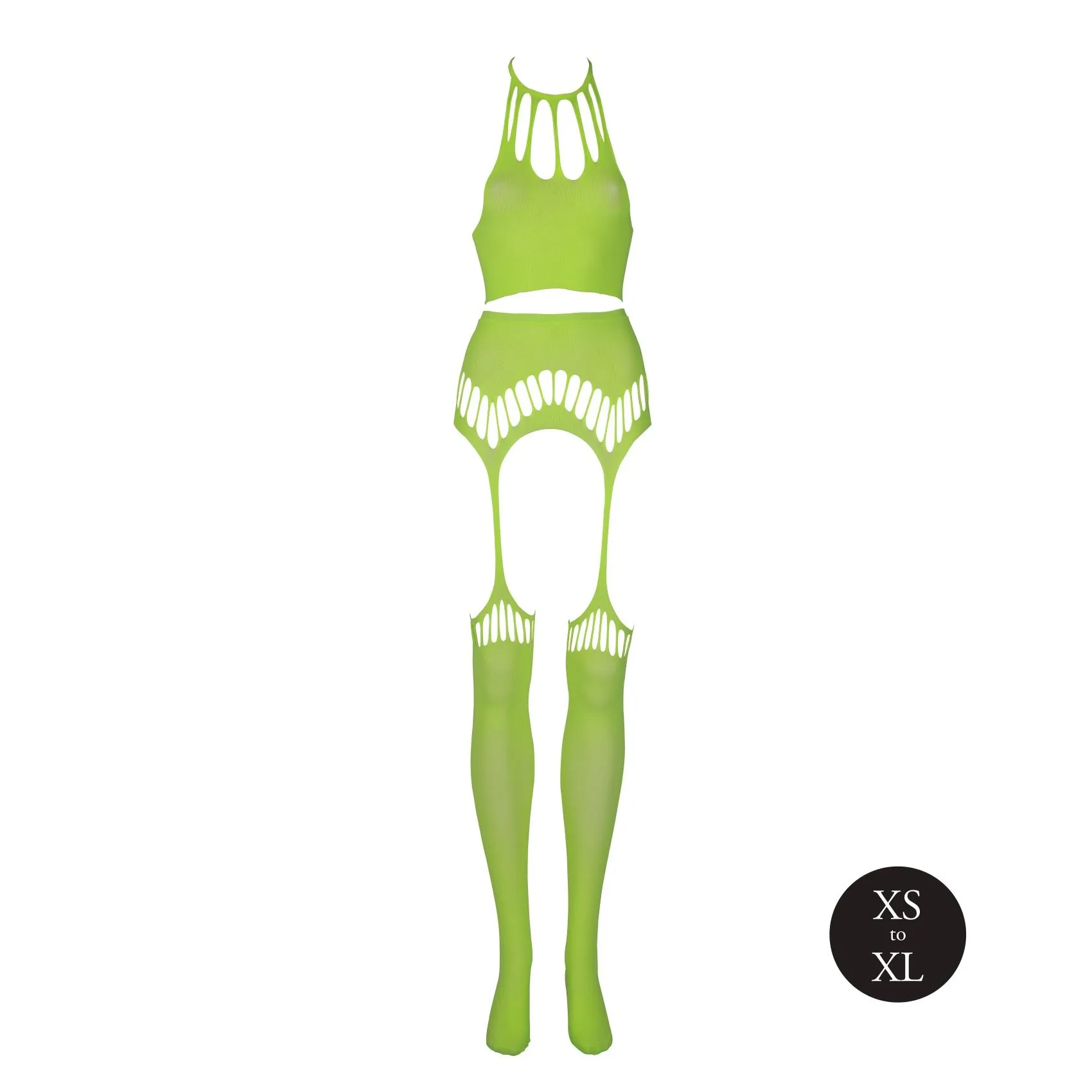 Bielizna Neonowa UV to ekskluzywny model, który wyróżnia się zarówno wyglądem, jak i funkcjonalnością. Wykonana z wysokiej jakości materiałów, w skład której wchodzi 92% nylonu oraz 8% spandexu/elasthanu, zapewnia komfortowe dopasowanie oraz pełną swobodę ruchów. Krótki top z dekoltem wiązanym na szyi idealnie podkreśla sylwetkę, podczas gdy dołączone pończochy z paskiem do pończoch dodają całości zmysłowego wyrazu.