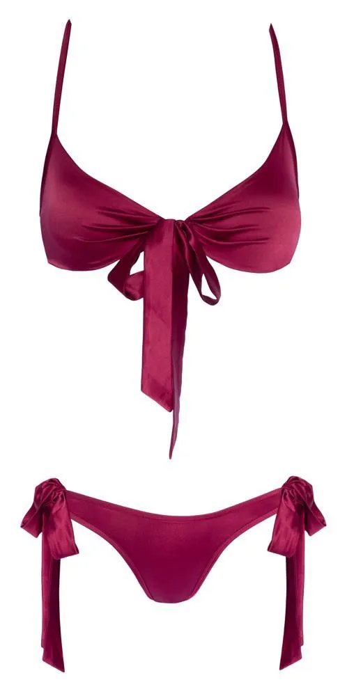 Biustonosz wyróżnia się designem halterneck, który można łatwo zawiązać na szyi. Taki krój podkreśla linię ramion, a jednocześnie jest praktyczny, umożliwiając dostosowanie do indywidualnych potrzeb. Poświęconą uwagę przyłożono również do majtek, które posiadają wiązane kokardki po bokach. Dzięki temu można je idealnie dopasować do własnej sylwetki, co sprawia, że komfort noszenia jest jeszcze większy.