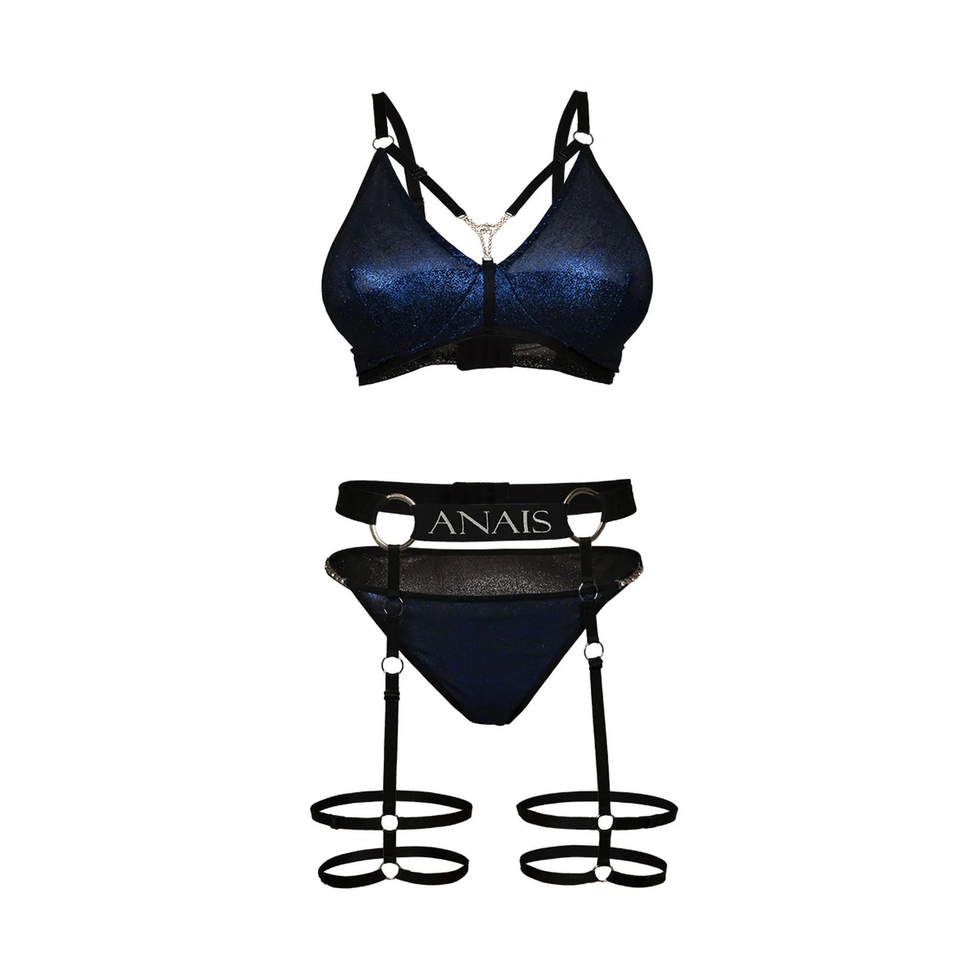 Olśniewający komplet HARLO w odcieniu niebieskim to idealne połączenie elegancji i zmysłowości. W jego skład wchodzi biustonosz, majtki oraz pas do pończoch, które razem tworzą wyjątkową całość. Komplet wyróżnia się błyszczącym, brokatowanym kolorem, który przyciąga wzrok i sprawia, że każda kobieta poczuje się pewnie i wyjątkowo.
