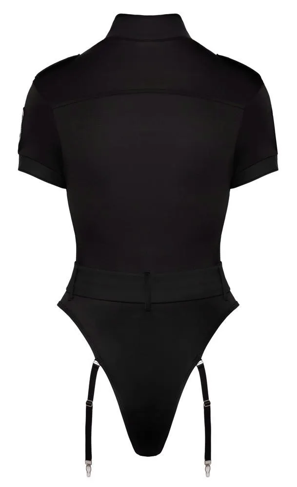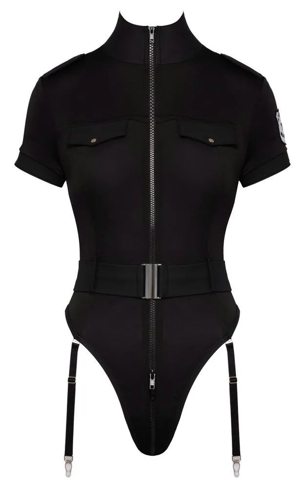 Ten unikalny model charakteryzuje się surowym krojem oraz wysokim dekoltem, a także półramieniem, co nadaje mu typowy policyjny charakter. Czarne body z przyciągającym wzrok emblematem umieszczonym na lewym ramieniu jest idealnym rozwiązaniem jako odzież do zadań specjalnych, jak również na imprezy tematyczne. Dodatkowo, klapy na ramionach i klatce piersiowej podkreślają jego unikalny styl oraz funkcjonalność.