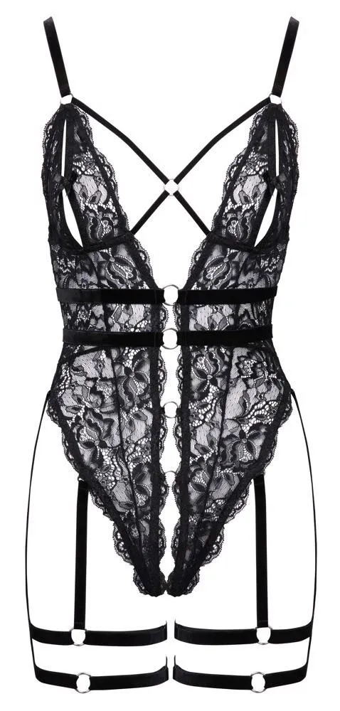 Prezentujemy czarne body koronowe Cottelli, które łączy w sobie elegancję oraz zmysłowość. Wykonane z miękkiej, elastycznej koronki w kwiatowy wzór, to body jest idealnym wyborem dla pewnych siebie kobiet, które pragną podkreślić swoje atuty. Całkowicie otwarte z przodu, ozdobione srebrnymi pierścieniami, sprawia, że jest to produkt wyjątkowy, który idealnie nadaje się na specjalne okazje oraz romantyczne wieczory.