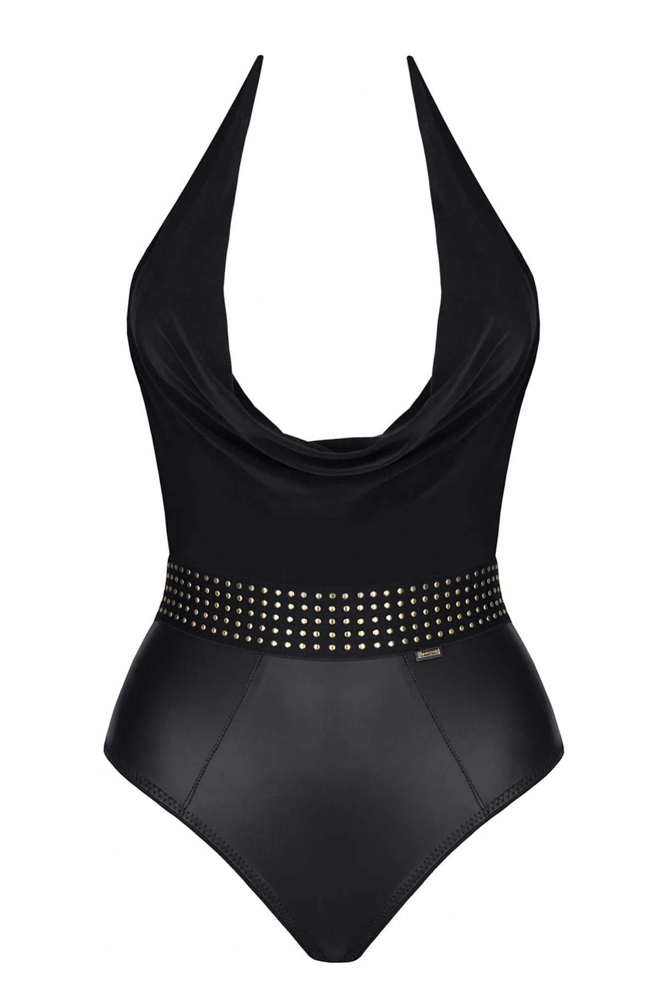Body SAMANTHA 001 to niezwykle stylowy i elegancki element garderoby, który z pewnością przyciągnie uwagę. Wykonane z czarnej, elastycznej dzianiny oraz wetlook, body to połączenie komfortu i wyrafinowania. Idealnie dopasowuje się do sylwetki, podkreślając krągłości bioder i pośladków, co sprawia, że każda kobieta poczuje się w nim wyjątkowo.