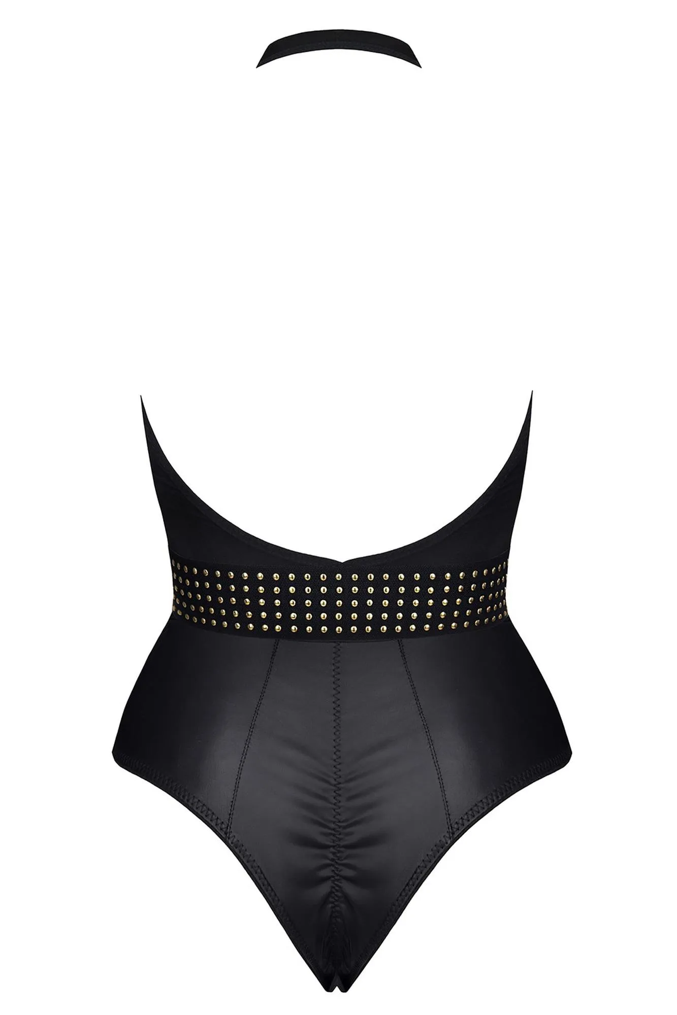Górna część body wykonana z delikatnej dzianiny sprawia, że świetnie układa się na biuście, oferując efektowny i elegancki dekolt. Warto zwrócić uwagę na ozdobną gumkę w linii pasa, która zdobiona złotymi aplikacjami, nie tylko pięknie się prezentuje, ale także optycznie definiuje wcięcie w pasie, dając wyjątkowy efekt.
