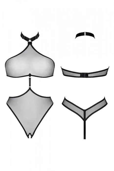Tylny panel, który jest starannie profilowany, doskonale podkreśla linię pośladków. Z przodu, zarówno górna jak i dolna część body są połączone elegancką gumką z srebrnym regulatorem, co dodaje całości wyjątkowego charakteru. Wszystkie metalowe elementy są trwałe i stylowe, w kolorze srebrnym, wykonane bez dodatku chromu i niklu, co zapewnia najwyższy standard jakości oraz bezpieczeństwa.