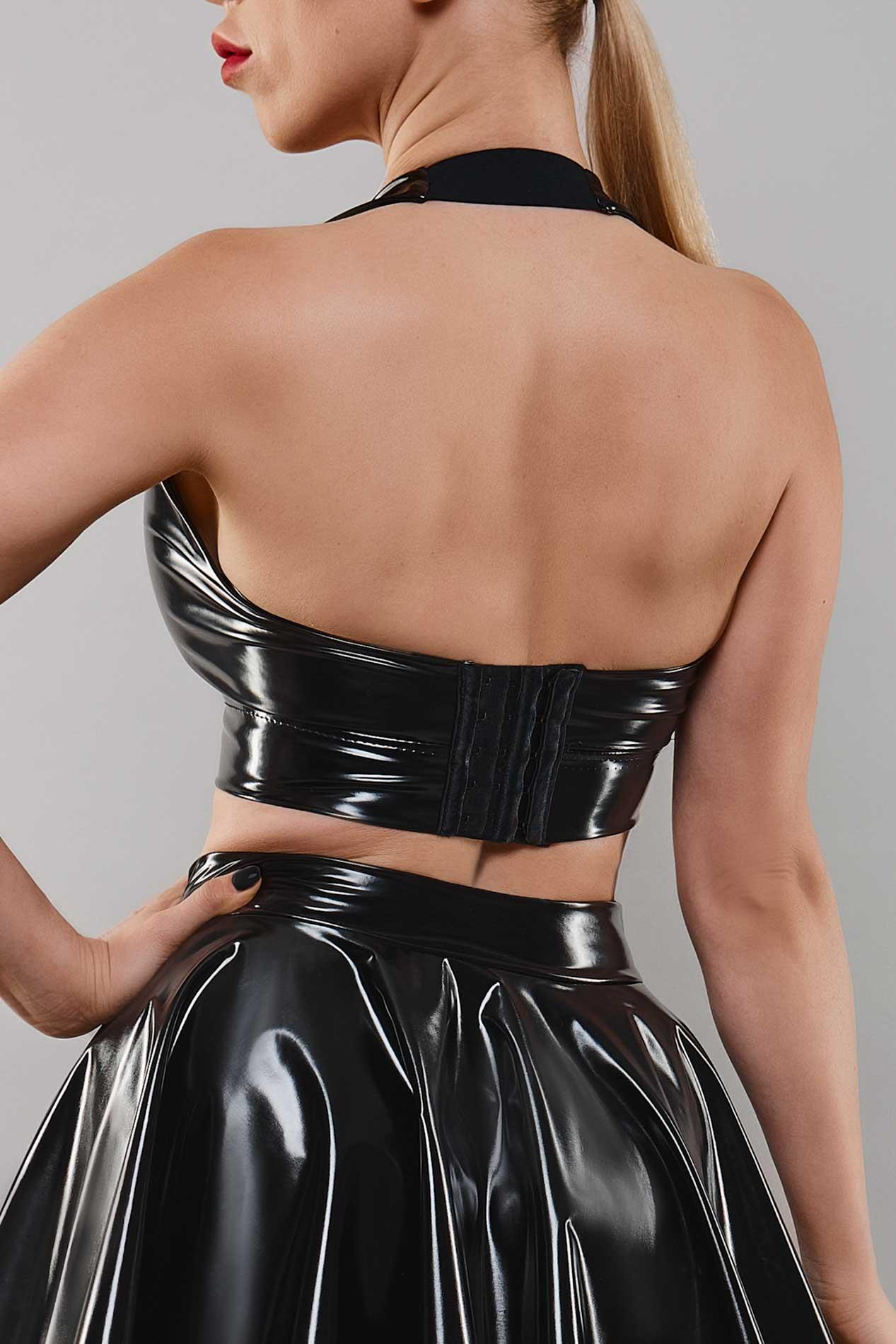 Projekt skupia się na zaakcentowaniu kobiecych kształtów — głęboki dekolt z przodu podkreśla biust, a odsłonięte plecy dodają lekkości i zmysłowego charakteru. Konstrukcja przewiduje praktyczne, dwustopniowe metalowe zapięcie na haftki, które ułatwia zakładanie oraz umożliwia precyzyjne dopasowanie do ciała. Solidne metalowe elementy zapewniają nie tylko estetykę, lecz także trwałość produktu.