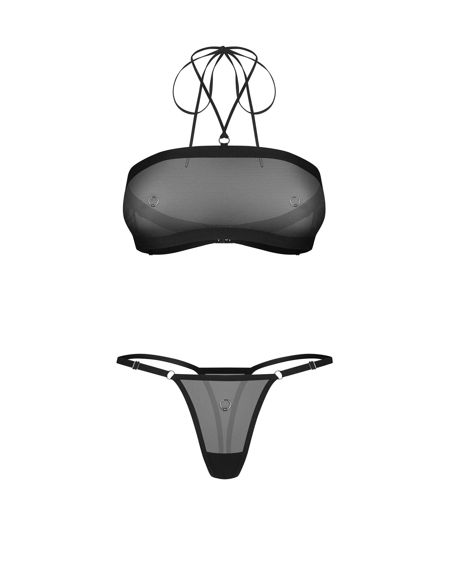 Body OBSESSIVE – komplet z siateczki z recyklingu, regulowane paski, metalowe ringi to nowoczesny, minimalistyczny zestaw bielizny zaprojektowany w Unii Europejskiej. Wykonany z meshu z recyklingu łączącego trwałość i lekkość, materiał zapewnia komfort noszenia i odpowiednią przepuszczalność powietrza. Konstrukcja składa się z topu oraz stringów, a całość podkreślają trzy dekoracyjne metalowe ringi wolne od niklu, które nadają kompozycji wyrazistego, prowokującego charakteru.