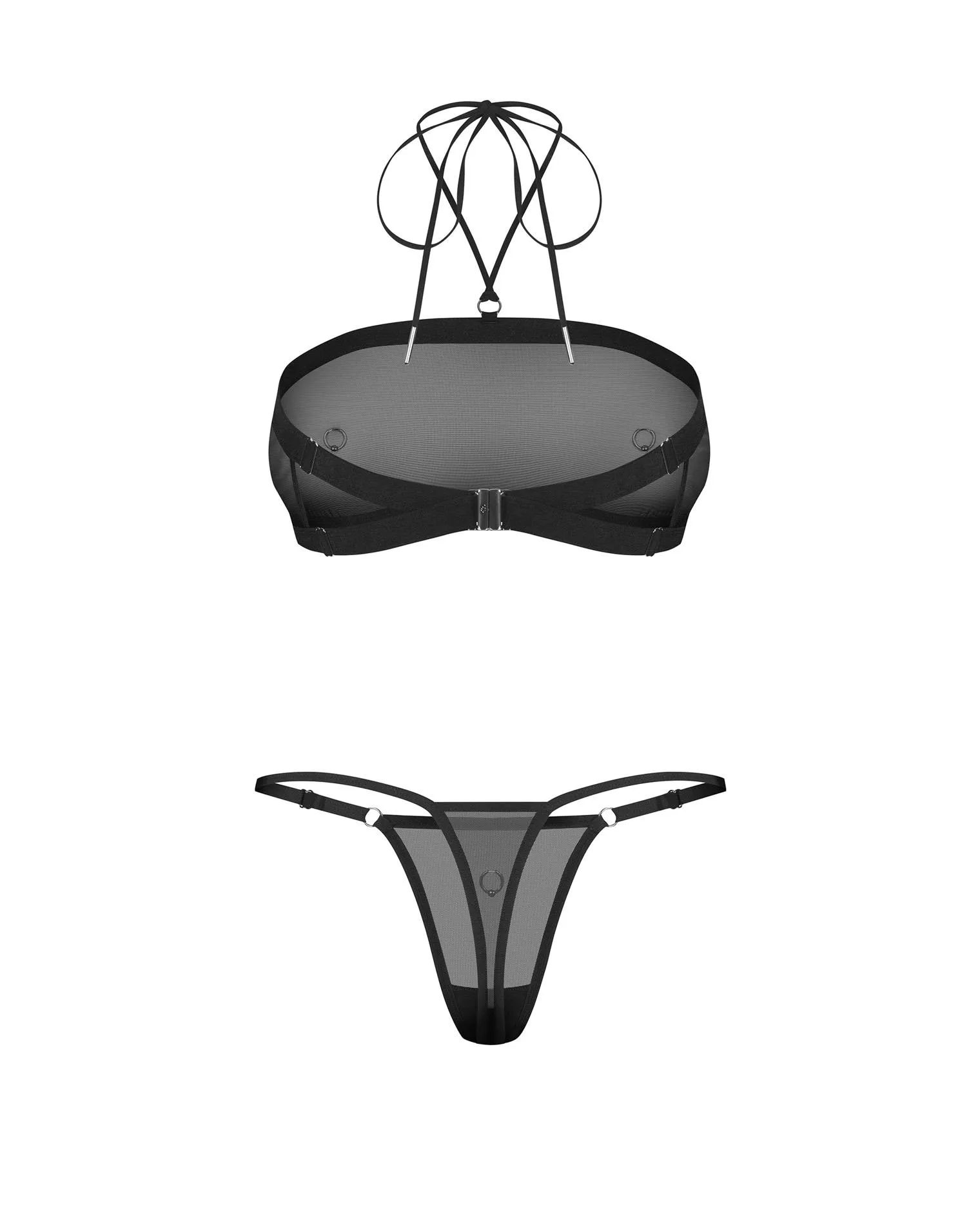 Body OBSESSIVE – mesh z recyklingu, regulowane paski, bezniklowe ringi L/XL to elegancki i odważny komplet bielizny wykonany z wysokiej jakości meshu pochodzącego z recyklingu. Produkt łączy nowoczesny, minimalistyczny design z precyzyjnym wykończeniem: składa się z topu oraz stringów, które subtelnie eksponują sylwetkę, zapewniając jednocześnie wygodę i trwałość. Dzięki elastycznym, regulowanym paskom oraz wiązaniu na szyi komplet daje możliwość idealnego dopasowania do różnych typów sylwetki.