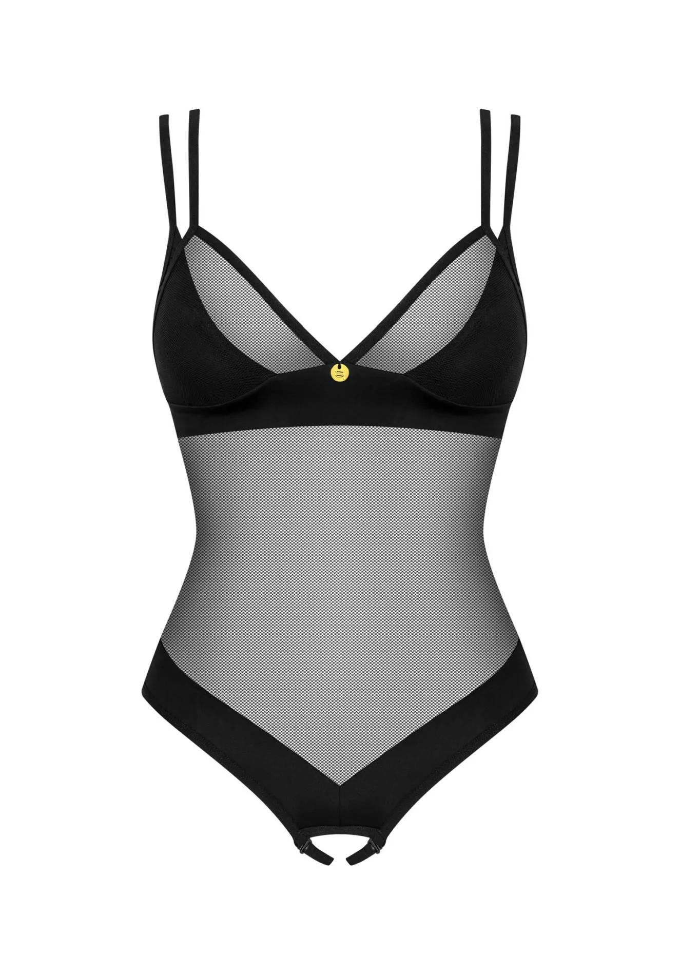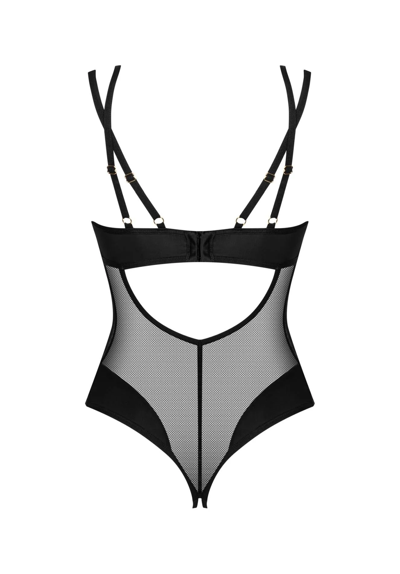 Transparentna siateczka w połączeniu z jednolitym materiałem sprawia, że body wyróżnia się na tle innych propozycji. Otwarty krój umożliwia swobodę ruchów i dodaje pikanterii całej stylizacji. Produkt posiada także kilkustopniowe zapięcie, co pozwala na jeszcze lepsze dopasowanie oraz wygodę noszenia. Dodatkowe ramiączka, które okalają dekolt, podkreślają kobiece kształty, zapewniając jednocześnie zniewalający wygląd.