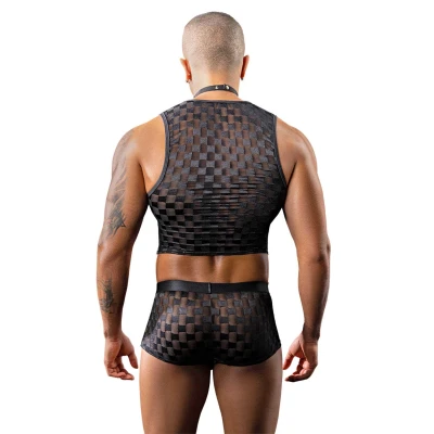 Komplet składa się z czterech elementów: body z długim rękawem (półprzezroczyste), czapki w stylu policjantki, naszyjnika typu choker oraz kajdanek. Długie rękawy body zapewniają dobre podtrzymanie i wygodę, natomiast elastyczny materiał gwarantuje swobodę ruchów. Połączenie kabaretek i elementów winylowych podkreśla sylwetkę, a realistyczne dodatki wzmacniają zamierzony charakter stroju.