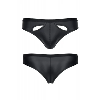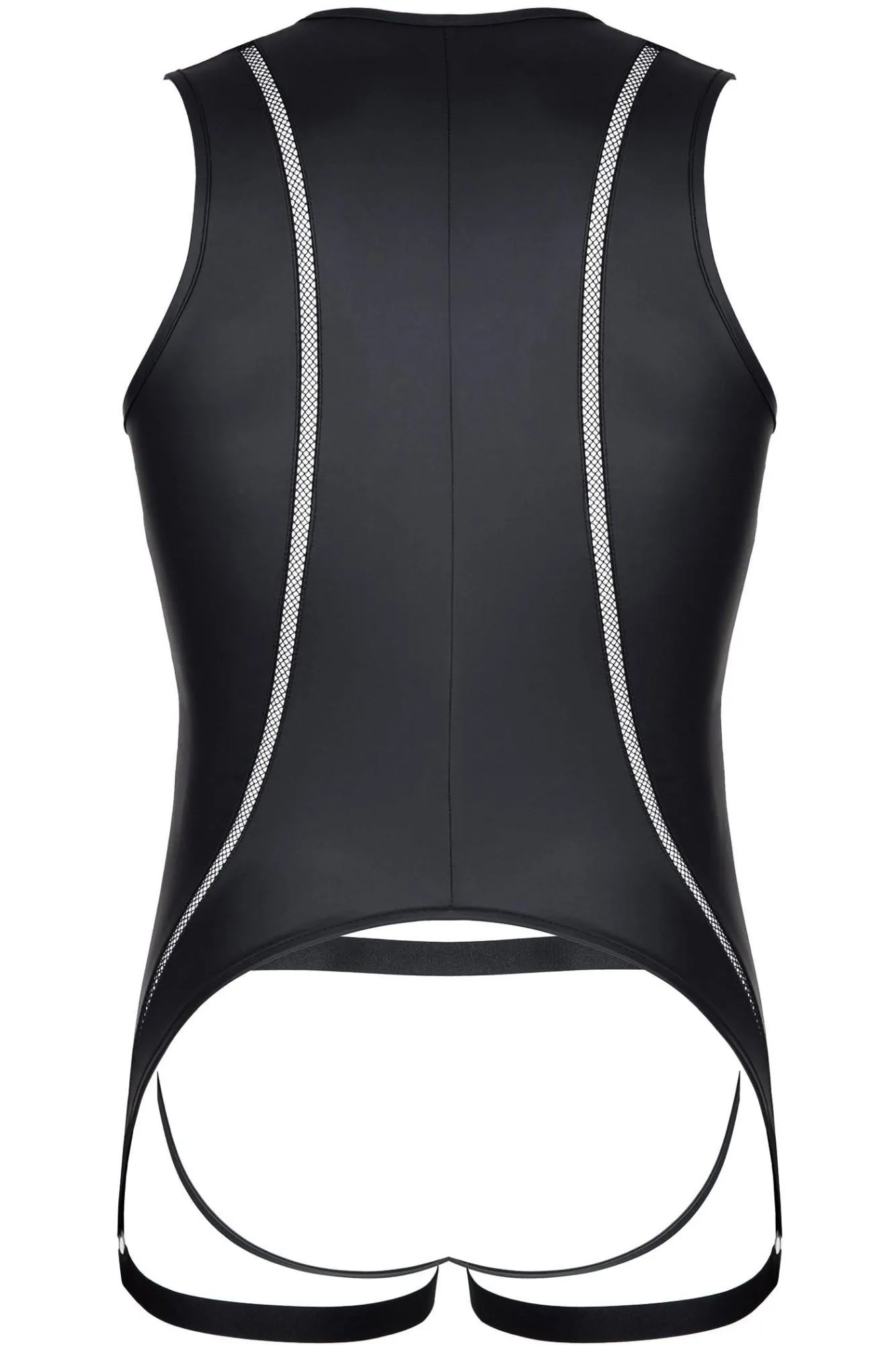 Body kończy się poniżej linii pośladków, gdzie zamontowane są paski z czarnej gumki, miłe w dotyku, a dzięki metalowym regulatorom można je dostosować do indywidualnych preferencji. Z tyłu, kolisty kształt efektownie eksponuje nagie pośladki, co znakomicie podkreśla zmysłowy charakter tego stroju. Do kompletu dołączone są majtki typu jockstrap, które z przodu mają ozdobne siateczki, a ich obwód został wykonany z miłej czarnej gumki o metalicznym połysku, co dodaje jeszcze więcej uroku.
