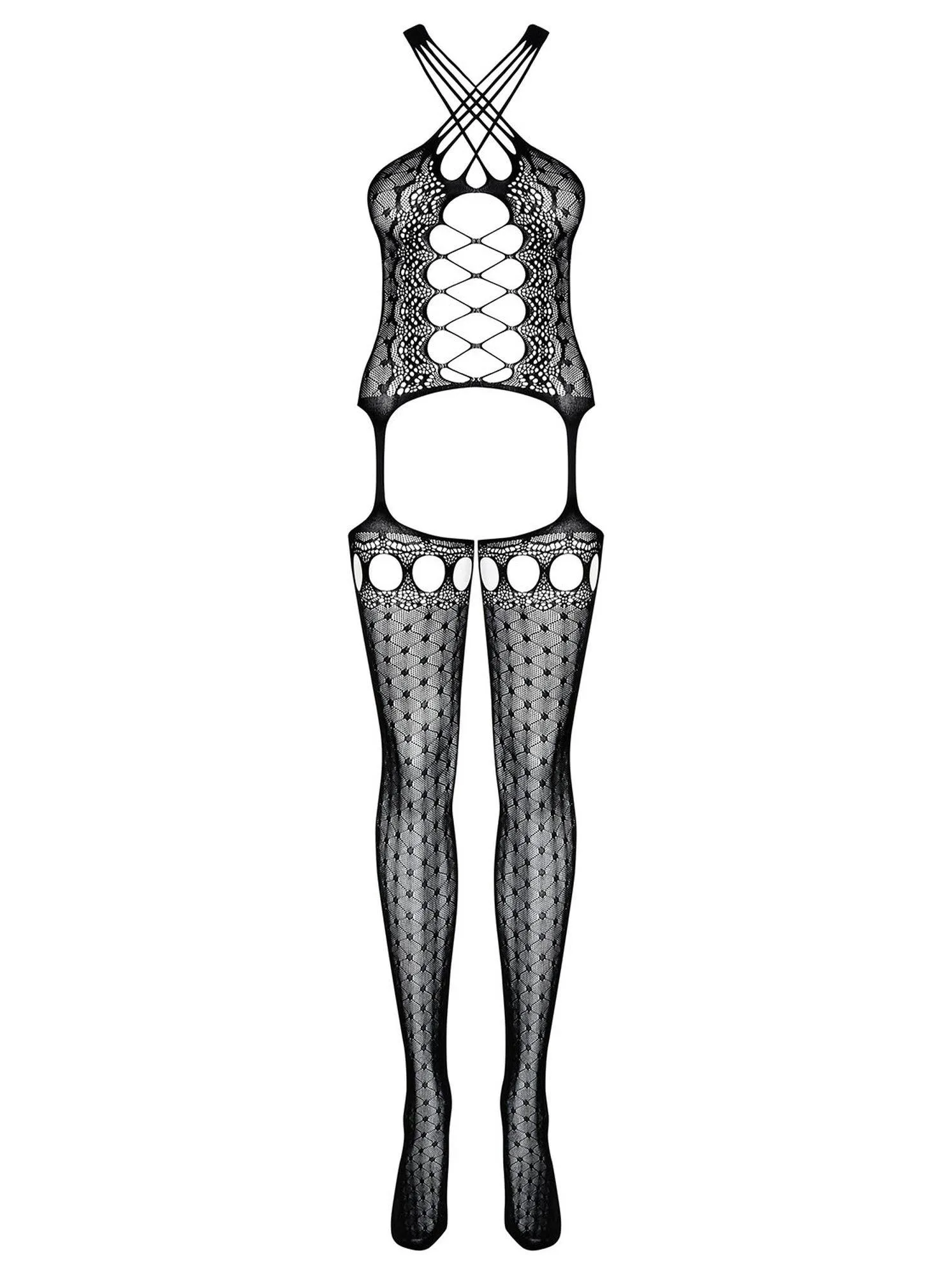Bodystocking charakteryzuje się wieloma funkcjonalnymi i estetycznymi detalami, które świetnie podkreślają kobiece kształty. Zastosowane pionowe wycięcia na brzuszku skutecznie optycznie wyszczuplają talię, a otwarte plecy i krzyżujące się paseczki dodają zmysłowego uroku. Dodatkowo, połączenie topu oraz pończoch eksponuje pośladki, a wcięcia na udach stanowią efektowny detal, który przyciąga wzrok.