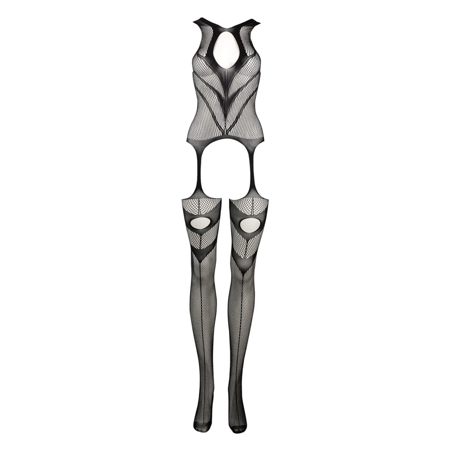 Bodystocking z suspensorami to produkt, który łączy w sobie elegancję i zmysłowość. Wykonany z elastycznego nylonu i spandexu, materiał ten charakteryzuje się wyjątkową rozciągliwością, co zapewnia doskonałe dopasowanie do sylwetki, oferując komfort noszenia dla rozmiarów S–XL. Dzięki temu bodystocking idealnie podkreśla kobiece kształty, a jednocześnie nie krępuje ruchów.