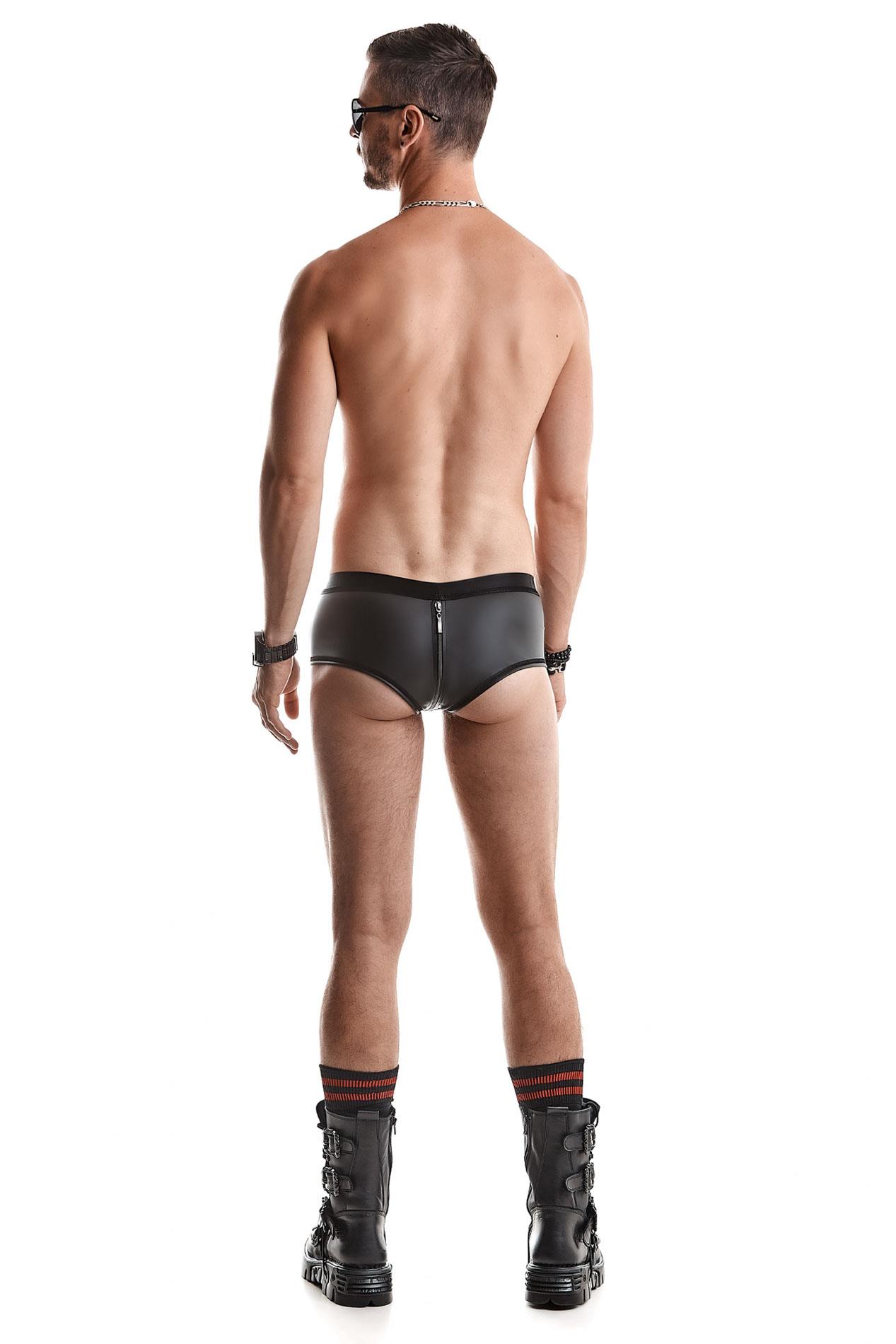 Model łączy gładki wetlook 360° z panelami z perforowanego wetlooku, które dodają oddechu skórze i podkreślają estetykę produktu. W górnej części znajduje się szeroka, miękka czarna gumka, która stabilnie utrzymuje szorty na miejscu, zapewniając jednocześnie komfort przy dłuższym użytkowaniu. Z przodu zastosowano ozdobne, srebrne metalowe napy oraz perforowane detale, a charakteru dodaje ciemny zamek błyskawiczny w kroku, odpinany zarówno z przodu, jak i z tyłu.
