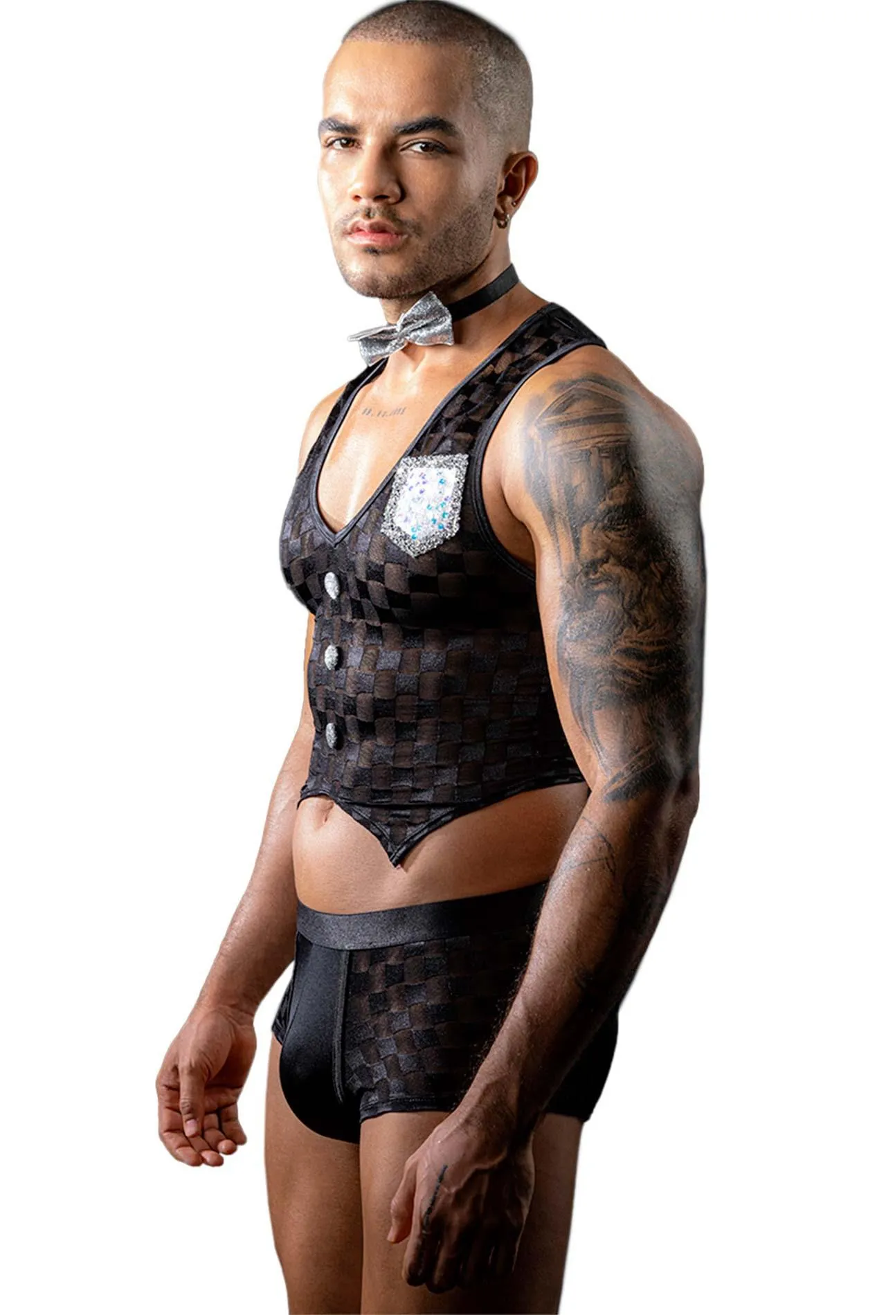 Costume PARIS HOLLYWOOD – kamizelka cekiny, półprzezroczyste bokserki, muszka to propozycja dedykowana mężczyznom poszukującym eleganckiego, a zarazem wyrazistego stroju do zabaw w role oraz na imprezy tematyczne. Zestaw składa się z trzech elementów: kraciastej kamizelki z kieszonką ozdobioną cyrkonią, półprzezroczystych, dopasowanych bokserków oraz muszki z cekinami w formie opaski na szyję. Materiał wykonania zapewnia elastyczność i komfort noszenia, co czyni kostium wygodnym podczas całonocnych wydarzeń.