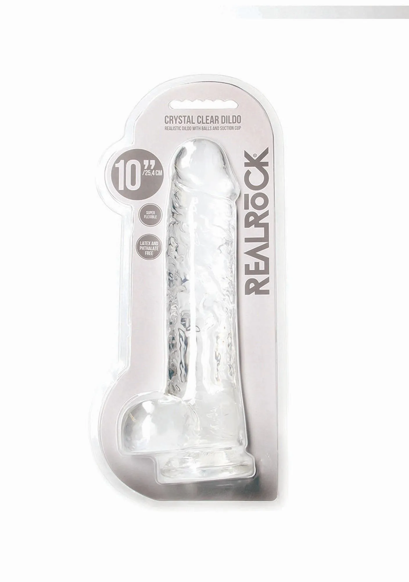 Dildo REALROCK CRYSTAL CLEAR - 10"/25,4 cm, z jądrami, wodoodporne, bez ftalanów