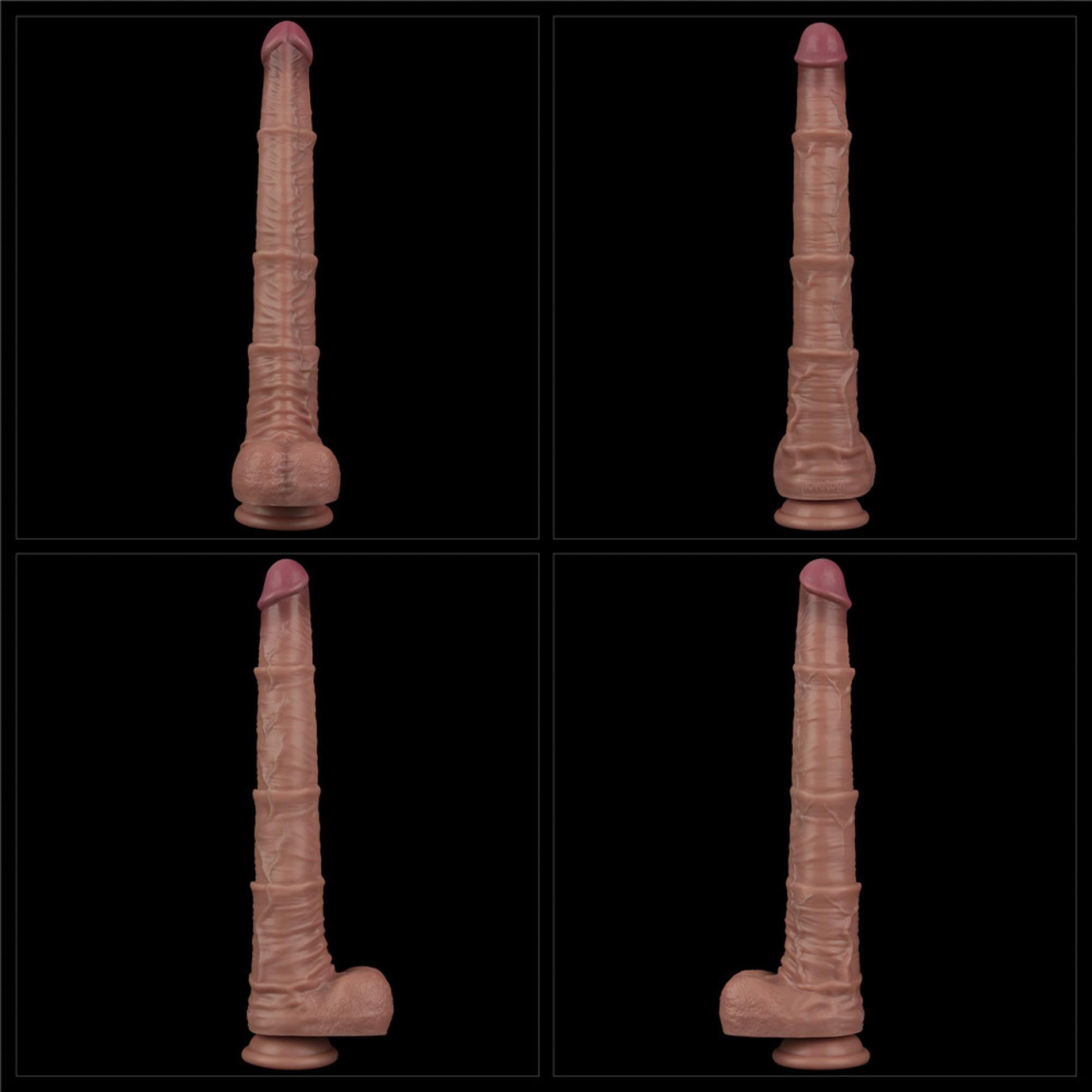 16'' Dual Layered Bendable Silicone Cock XXL to zaawansowane dildo, które zostało zaprojektowane, aby dostarczać niezwykle realistycznych doznań. Dzięki dwuwarstwowemu silikonowi, jego struktura doskonale naśladuje naturalny dotyk, zapewniając przyjemność, która zaspokoi nawet najbardziej wymagających użytkowników. Wyraźnie zaznaczona główka oraz teksturowany trzon dostarczają intensywnych doznań zarówno podczas penetracji, jak i w trakcie stymulacji zewnętrznej.