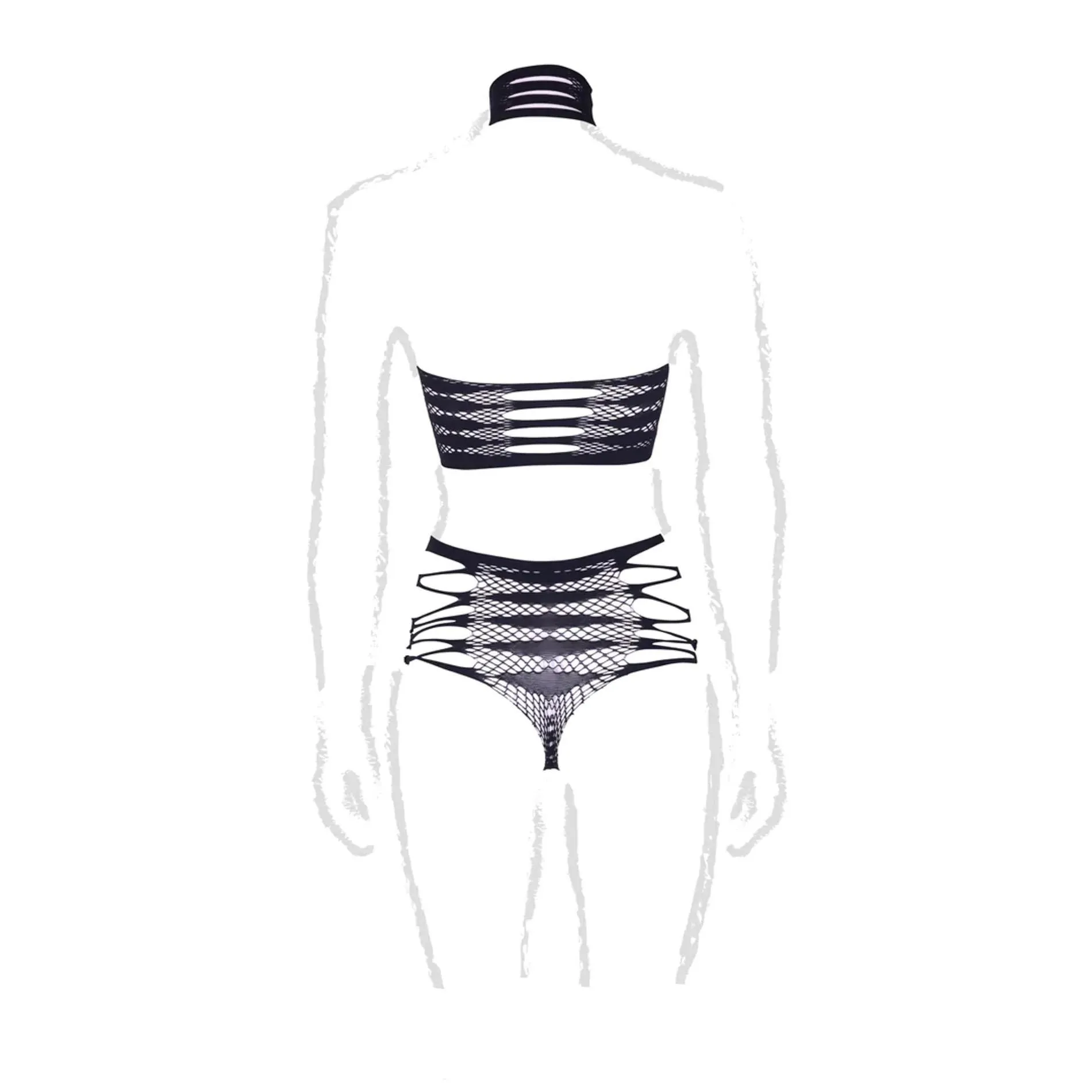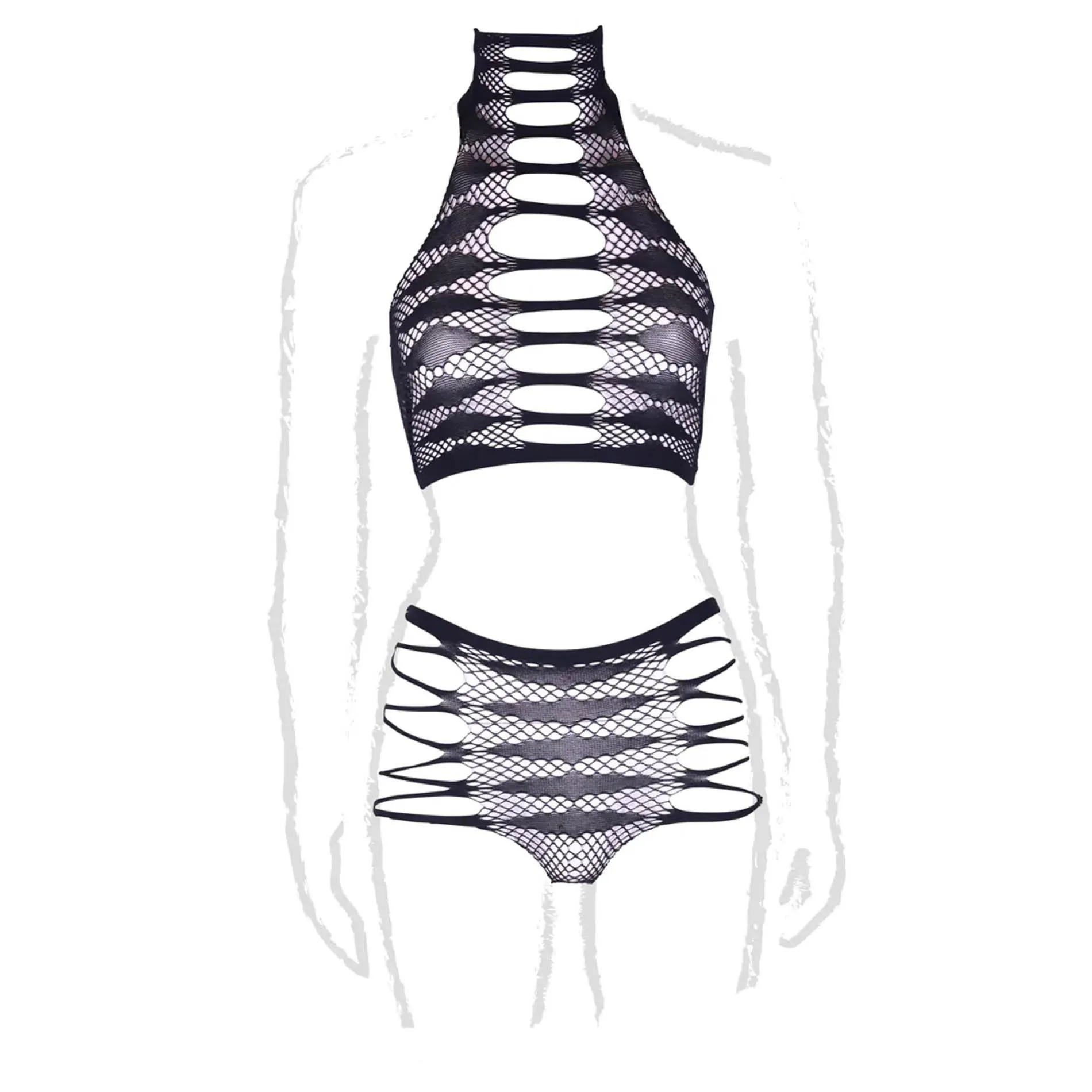 Komplet składa się z modnego turtlenecka oraz crop topu, które są doskonałym połączeniem odwagi i stylu. Oba elementy zaprojektowane są w taki sposób, aby odsłonić skórę w sposób intrygujący i uwodzicielski, tworząc jednocześnie efektowny wygląd. Dodatkowo, majtki w tym zestawie harmonijnie dopełniają całość, a ich unikatowe wzornictwo przyciąga wzrok.