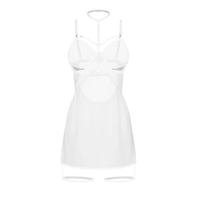 W skład kompletu wchodzi zarówno koszulka, jak i stringi, co czyni go wyjątkowym wyborem do sypialni oraz na romantyczne wieczory. Całość wykonana jest z przyjemnego w dotyku materiału, składającego się z 85% poliamidu i 15% elastanu, co zapewnia nie tylko estetyczny wygląd, ale również komfort noszenia przez całą noc. Dodatkowy akcent stanowi srebrna elegancka zawieszka, która dodaje całości wyjątkowego uroku.