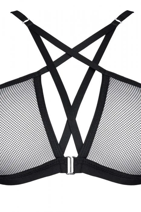 Biustonosz wyróżnia się efektownym srebrnym metalowym zapięciem oraz stylizowanym symbolem pentagramu z czarnych gumek, co przyciąga wzrok i dodaje zmysłowego wyrazu. Z tyłu znajduje się elegancka kompozycja z gumek, które można dostosować dzięki srebrnym metalowym regulatorom. Stringi do kompletu charakteryzują się ozdobnymi gumkami oraz szeroką górą, co sprawia, że idealnie dopasowują się do sylwetki, podkreślając krągłości ciała.