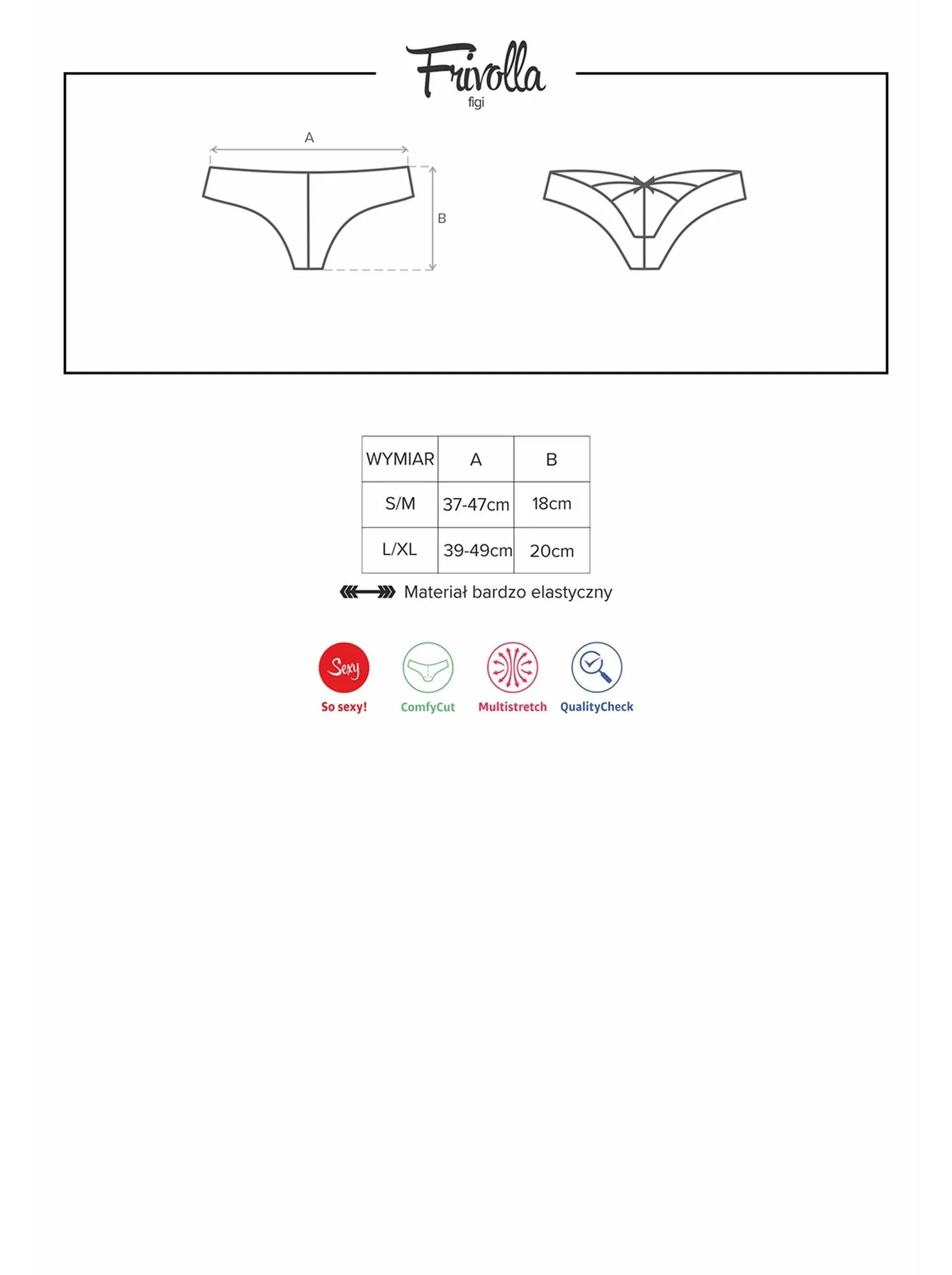 Przód fig ma klasyczny, stonowany wygląd, który kontrastuje z ich zjawiskowym tyłem. Unikalne detale, takie jak seksownie oplecione pośladki oraz delikatna kokardka, dodają całości zmysłowego charakteru. Dzięki innowacyjnemu rozwiązaniu ComfyCut, figi zapewniają niezwykłą wygodę, a jednocześnie uwydatniają figurę w atrakcyjny sposób.