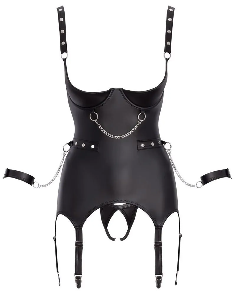 Ten ekscytujący zestaw zawiera nie tylko gorset basque, ale również stringi z otwartym krokiem, co czyni go idealnym wyborem dla kobiet pragnących zaszaleć w sypialni. Gorset wyposażony jest w otwarte miseczki z delikatnym usztywnieniem i fiszbinami, które doskonale eksponują biust. Dodatkowo, regulowane ramiączka oraz zapięcie na haftki z tyłu pozwalają na indywidualne dopasowanie.