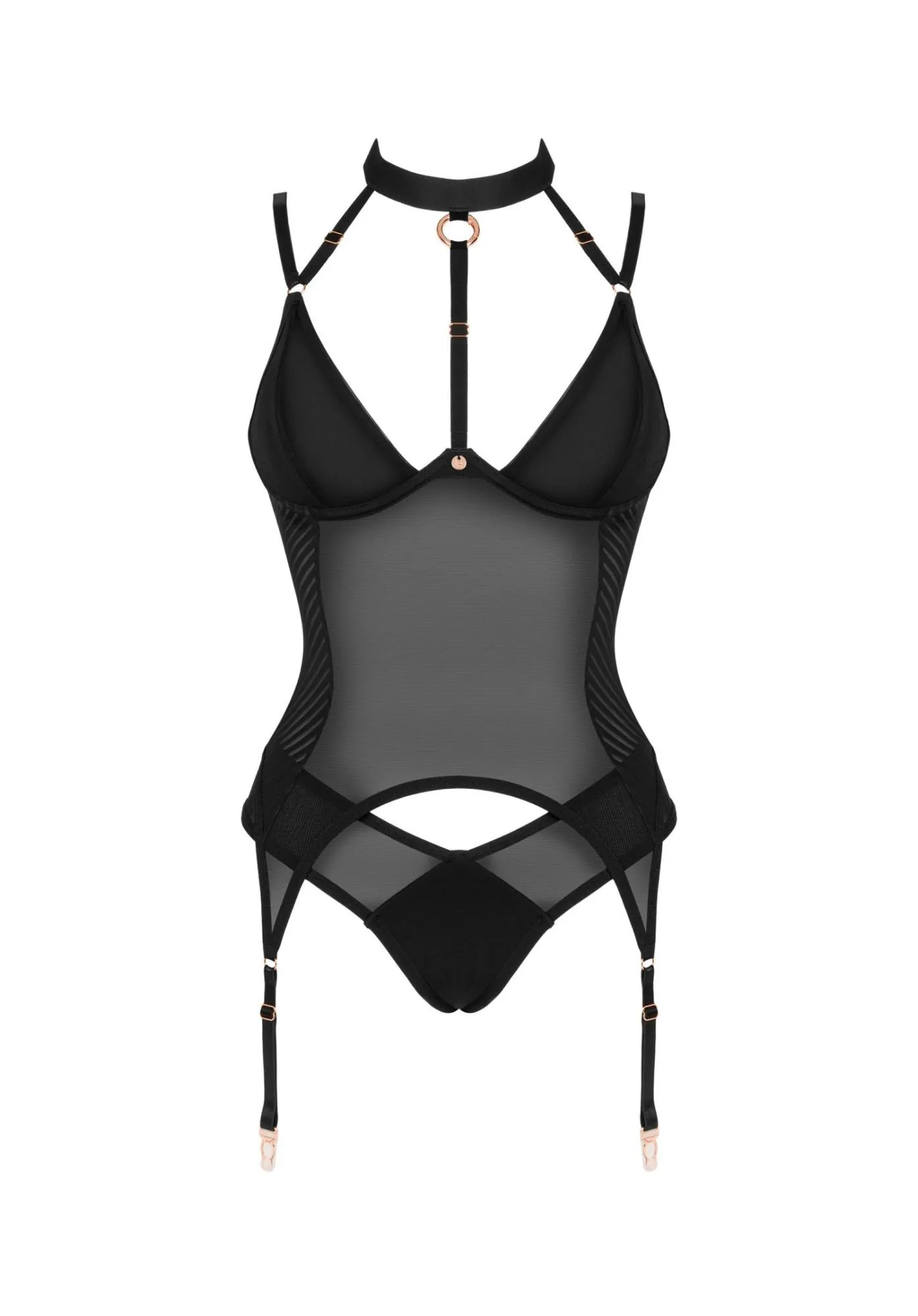 W skład kompletu wchodzi gorset oraz figi, które doskonale komponują się ze sobą, tworząc elegancki zestaw. Fiszbiny w miseczkach zapewniają doskonałe podtrzymanie biustu, podczas gdy odpinany pasek między piersiami pozwala na personalizację stylizacji. Dodatkowo, regulowane paski do pończoch oferują jeszcze większą funkcjonalność i wygodę, umożliwiając dopasowanie do indywidualnych potrzeb.