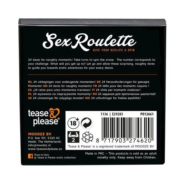 Odkryj nowy wymiar intensywności w swoim życiu erotycznym dzięki grze erotycznej Sex Roulette Tease and Please. To unikalne doświadczenie, które pozwala na eksplorację przeróżnych zabawnych i zmysłowych wyzwań, daje możliwość wyjścia poza standardowe ramy intymności. Dzięki innowacyjnemu mechanizmowi gry, wystarczy jeden ruch strzałki planszy, by wskazać na jedno z 24 ekscytujących wyzwań, które podgrzeją atmosferę między Tobą a Twoim partnerem.