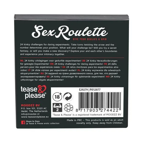Wprowadź odrobinę przygody do swojego życia intymnego z grą erotyczną Tease and Please Sex Roulette. To wyjątkowa gra, która pozwala Ci na odkrywanie i eksplorowanie swoich najskrytszych fantazji. Strzałka na planszy kieruje Cię ku niespodziewanym wyzwaniom, które sprawią, że każda gra stanie się niezapomnianym przeżyciem. Przygotuj się na emocjonującą podróż pełną intymności i namiętności.