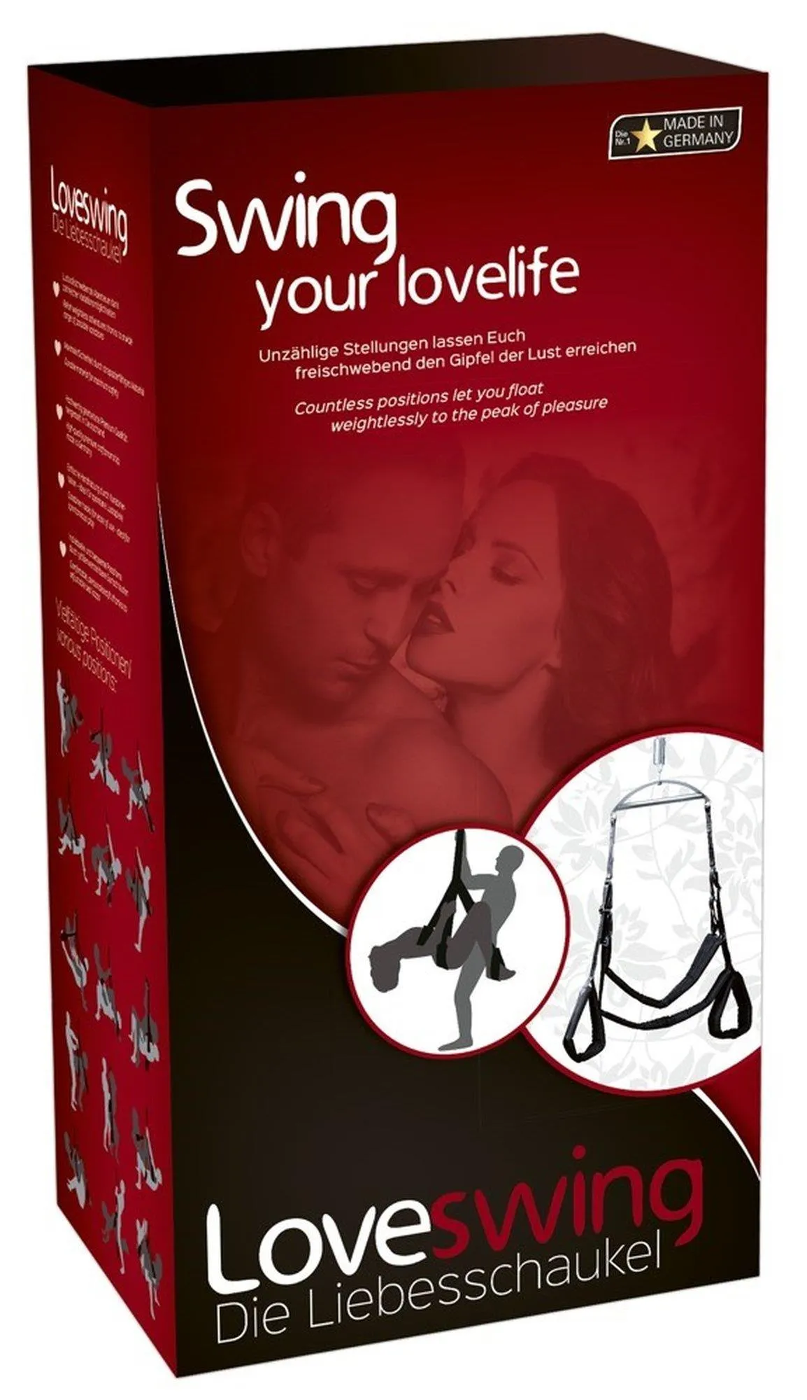 Huśtawka "Love Swing" została zaprojektowana, aby sprostać różnorodnym oczekiwaniom. Dzięki jej konstrukcji dostępne są nieograniczone pozycje, które pozwolą Ci na odkrywanie nowych doznań. Wyściółka z 100% polipropylenu oraz pianka PE zapewniają wygodę, a metalowe akcesoria (suwak z błyszczącym niklem, karabinek cinkowany) eliminują obawy o trwałość produktu. Niezależnie od Twoich preferencji, huśtawka dostosuje się do Twoich potrzeb, oferując mnóstwo możliwości do zabawy.