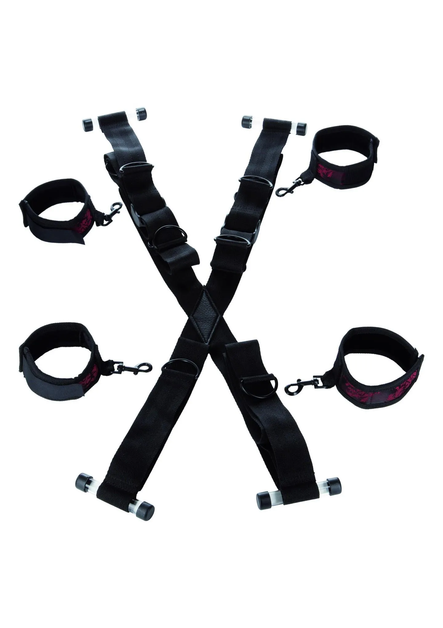System kajdanek oferuje cztery blokady, które skutecznie ograniczają ruchliwość osoby uległej. Krzyżujące się pasy pozwalają na ich odpowiednie umiejscowienie, co umożliwia uzyskanie pełnej kontroli nad sytuacją. Dodatkowo, górna część systemu ma dwie wysokości przypięcia rąk do wyboru, co zwiększa wszechstronność i dostosowanie do preferencji użytkownika.
