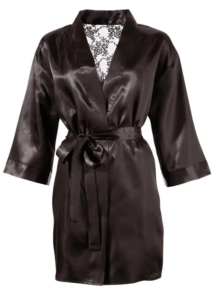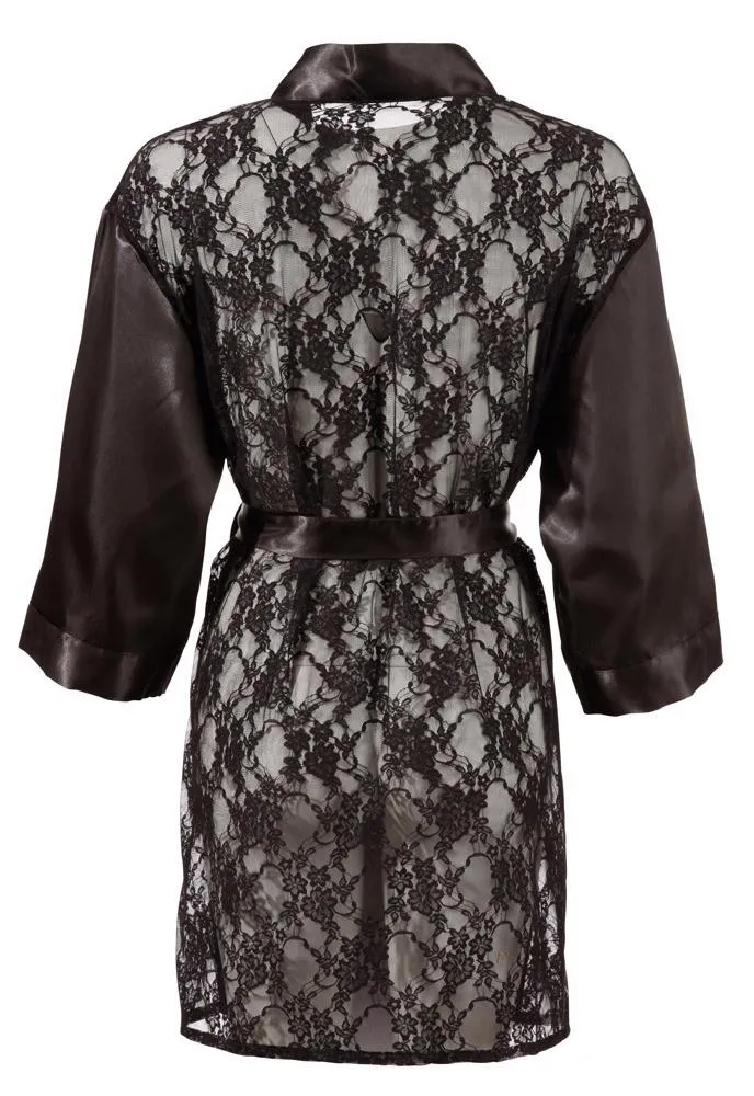 Kimono to charakteryzuje się krótkimi rękawami oraz małą wiązana kokardką z przodu, co wprowadza odrobinę uroku oraz kobiecości. Dodatkowo, odpinany wiązany pasek w talii umożliwia idealne dopasowanie do sylwetki, podkreślając atuty figury. Z tyłu kimono jest w całości wykonane z koronki o kwiatowym motywie, co czyni je wyjątkowym elementem bielizny nocnej.
