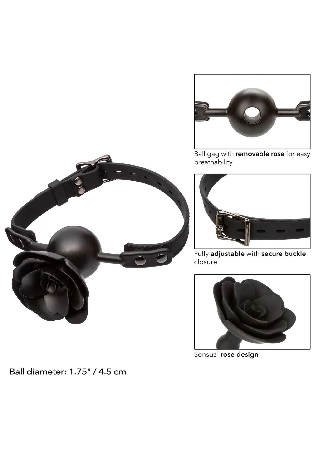 Oferujemy Knebel kulkowy z różą Forbidden, innowacyjny akcesorium, które wzbogaci Twoje erotyczne doznań. Ten regulowany knebel został zaprojektowany z myślą o maksymalnej wygodzie i bezpieczeństwie użytkowania. Jego kulka o średnicy 4,5 cm zapewnia komfortowe noszenie, a zdejmowana róża nie tylko dodaje szyku, ale również ułatwia oddychanie. To idealny wybór dla tych, którzy chcą eksplorować swoje granice w sposób świadomy i przyjemny.