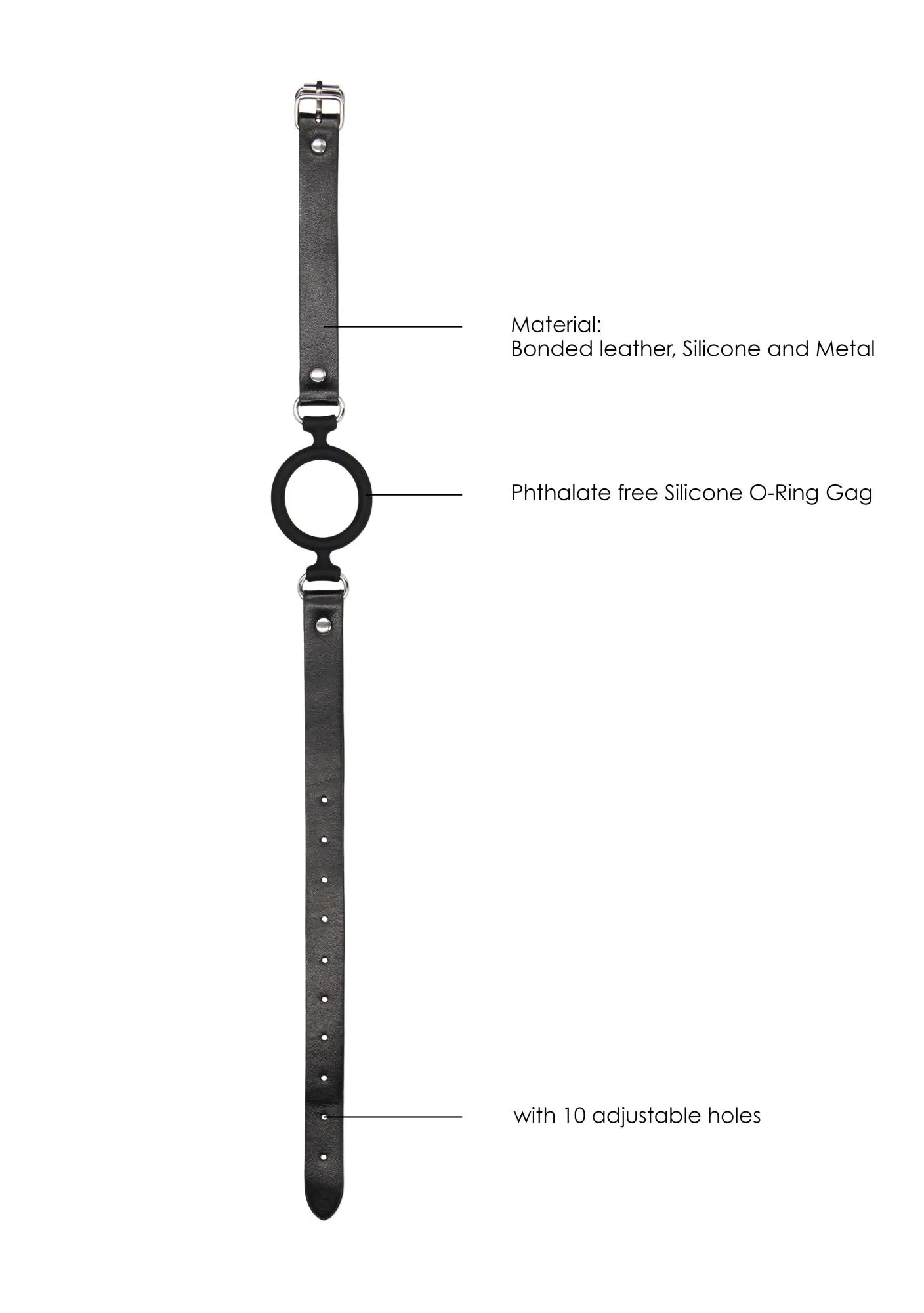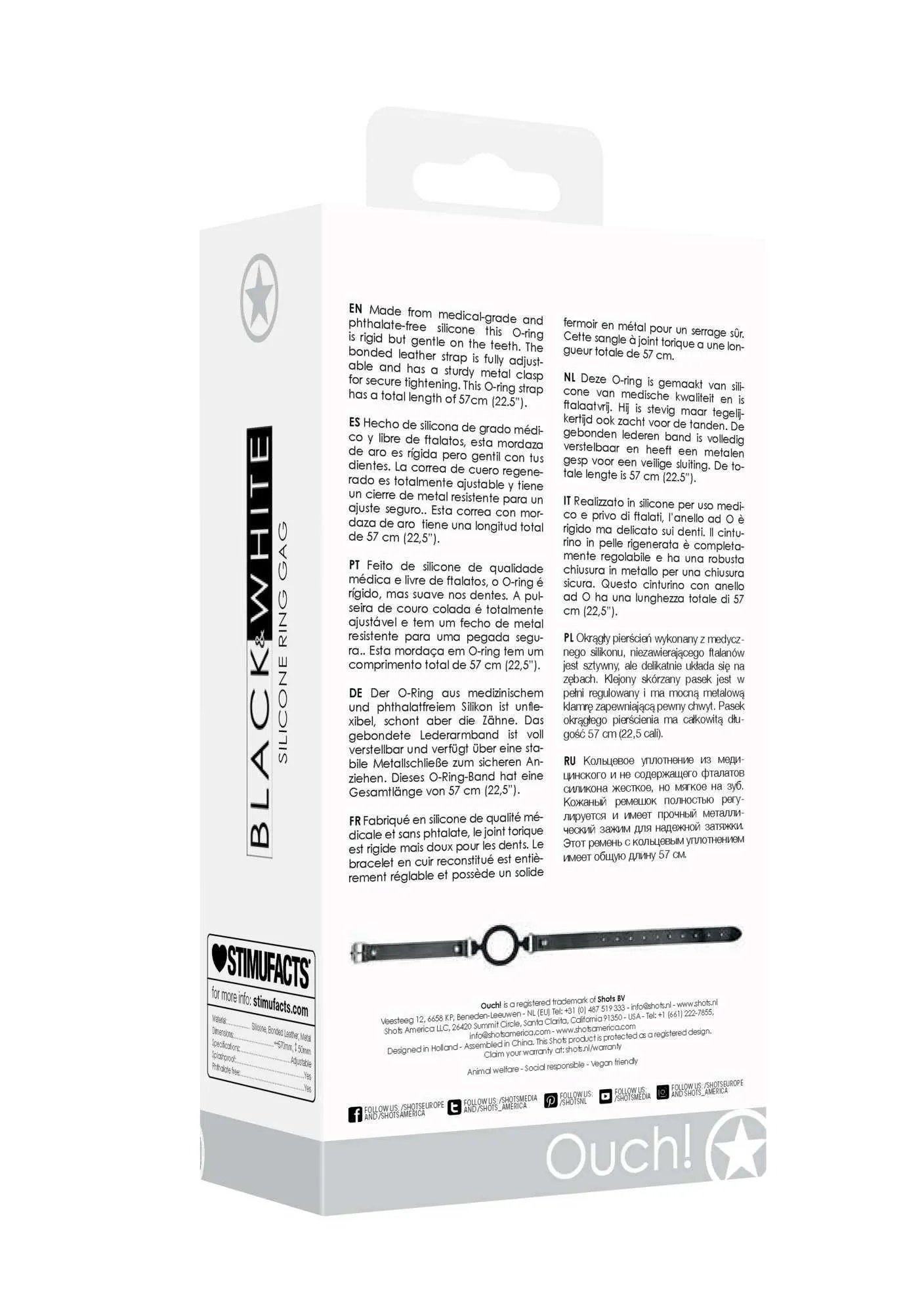 Pierścień knebla wykonany z wysokiej jakości materiałów jest sztywny, lecz jednocześnie delikatny dla zębów. Materiał ten nie zawiera ftalanów, co stanowi dodatkowe bezpieczeństwo dla zdrowia użytkowników. W pełni regulowany skórzany pasek został wyposażony w silną metalową klamrę, co zapewnia solidne trzymanie oraz stabilność w każdej sytuacji. Całkowita długość paska wynosi 57 cm (22,5 cala), co sprawia, że jest idealnym wyborem dla osób ceniących sobie zarówno wygodę, jak i funkcjonalność.