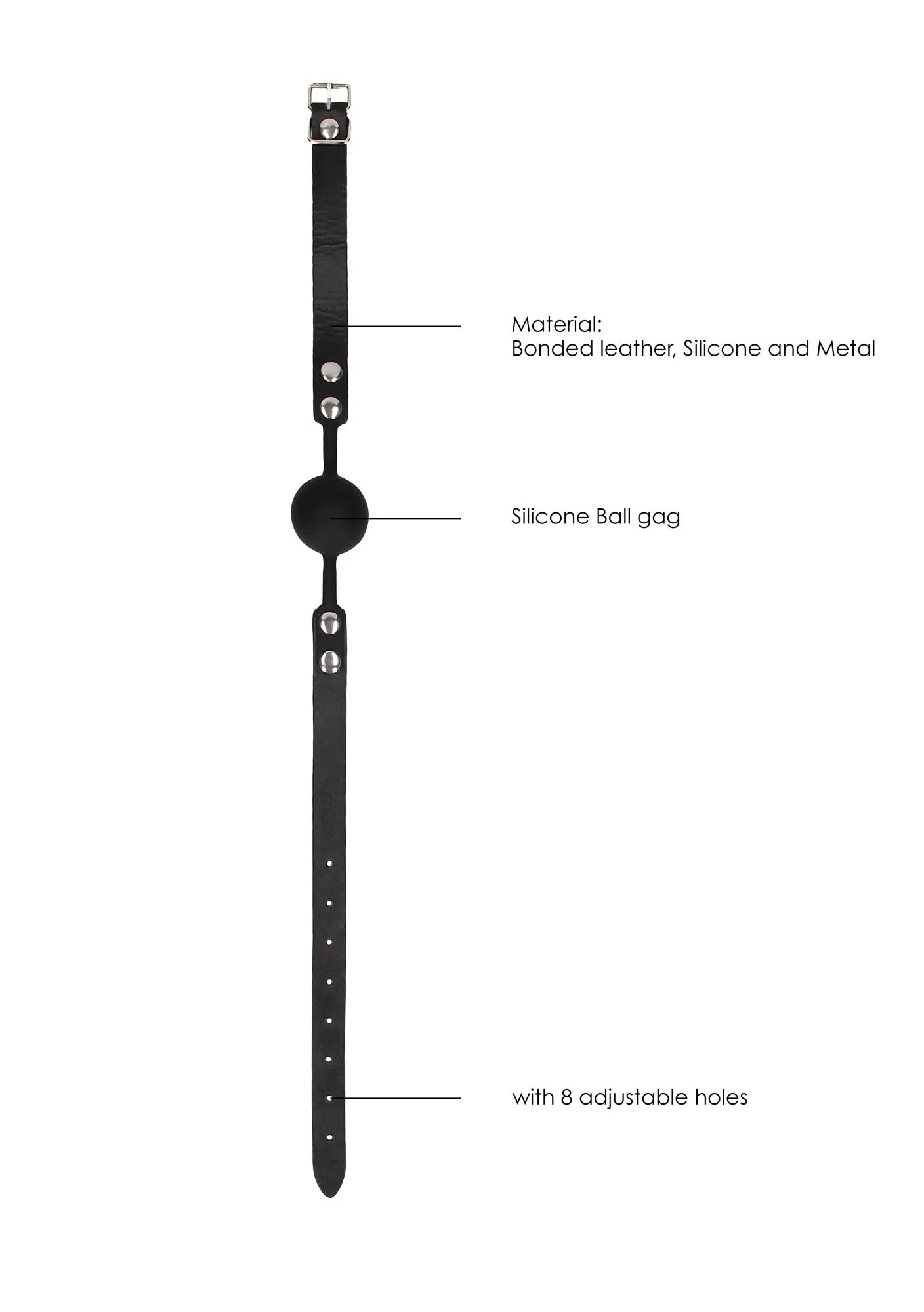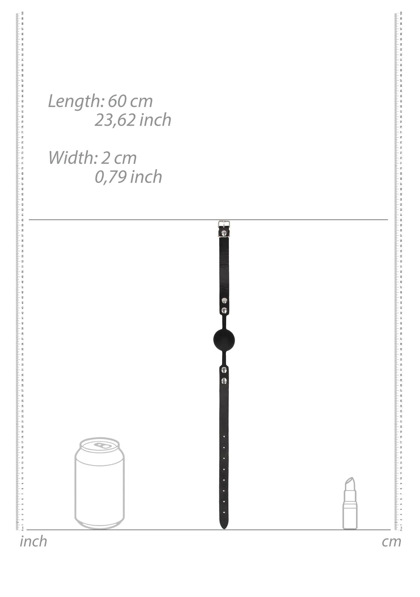 Szczególną uwagę zwrócono na regulowane skórzane paski, które są zarówno trwałe, jak i eleganckie. Dostosowanie do indywidualnych potrzeb jest niezwykle proste, dzięki 8 dziurkom, które pozwalają na precyzyjne dopasowanie. Wymiary knebla wynoszą 62 x 1,9 x 4,2 cm, a średnica wynosząca 4,2 cm zapewnia komfort, jednocześnie skutecznie ograniczając możliwość mówienia.