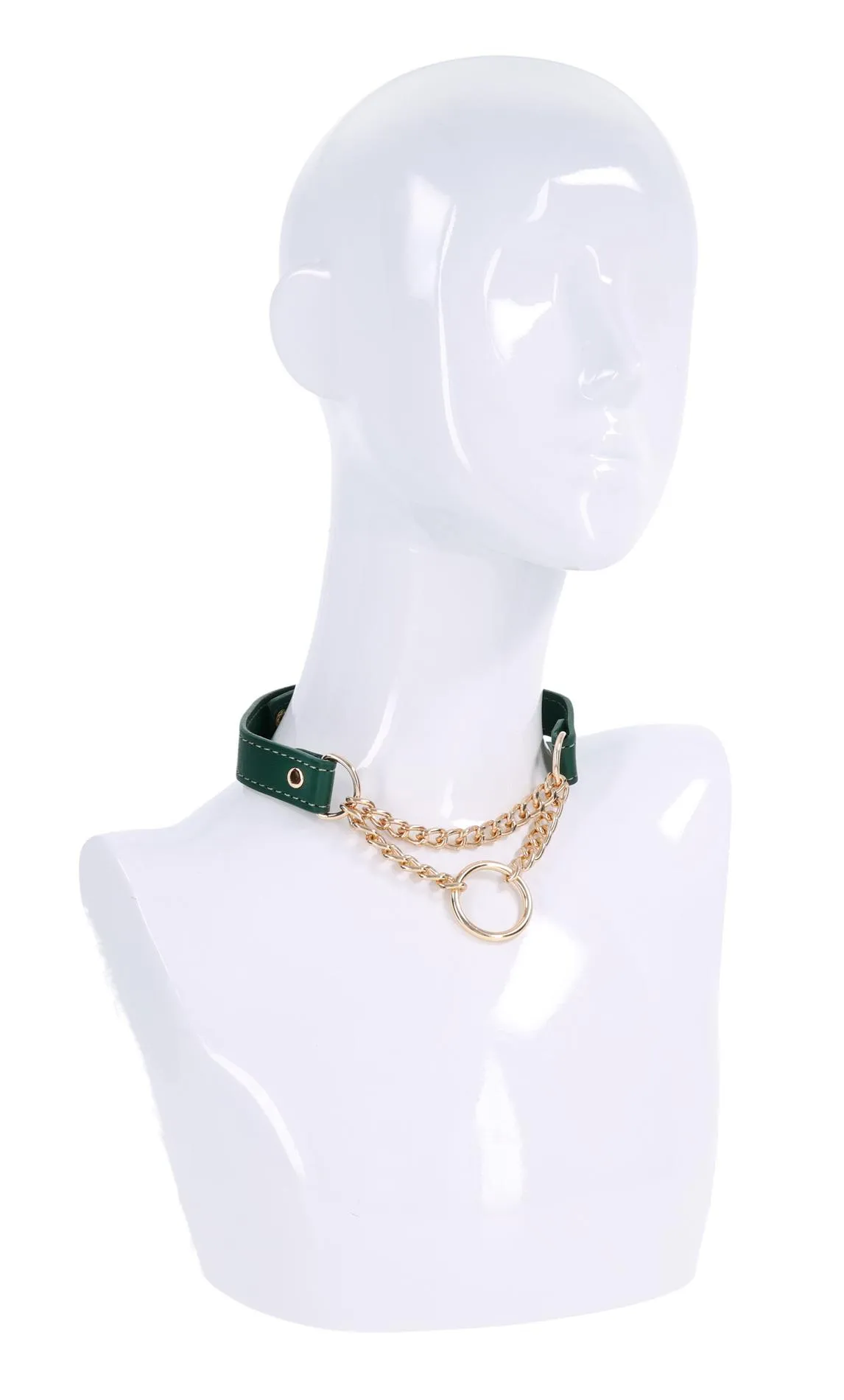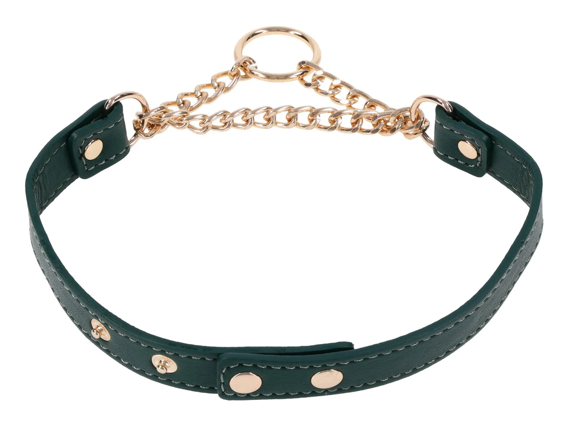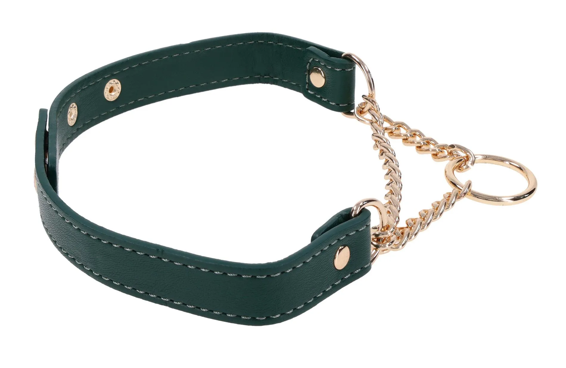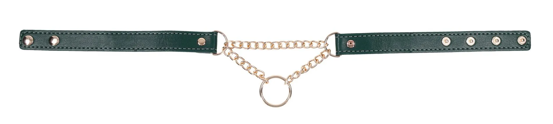 Kołnierz wyposażono w stylowe złote okucia, które podkreślają wykończenie w odcieniu szmaragdowej eko-skóry. Lekka konstrukcja została zaprojektowana z myślą o codziennym użytkowaniu — zarówno w sytuacjach publicznych, jak i prywatnych. Dodatkowe nity (napy) zwiększają zakres regulacji, co czyni produkt bardziej uniwersalnym i inkluzywnym.