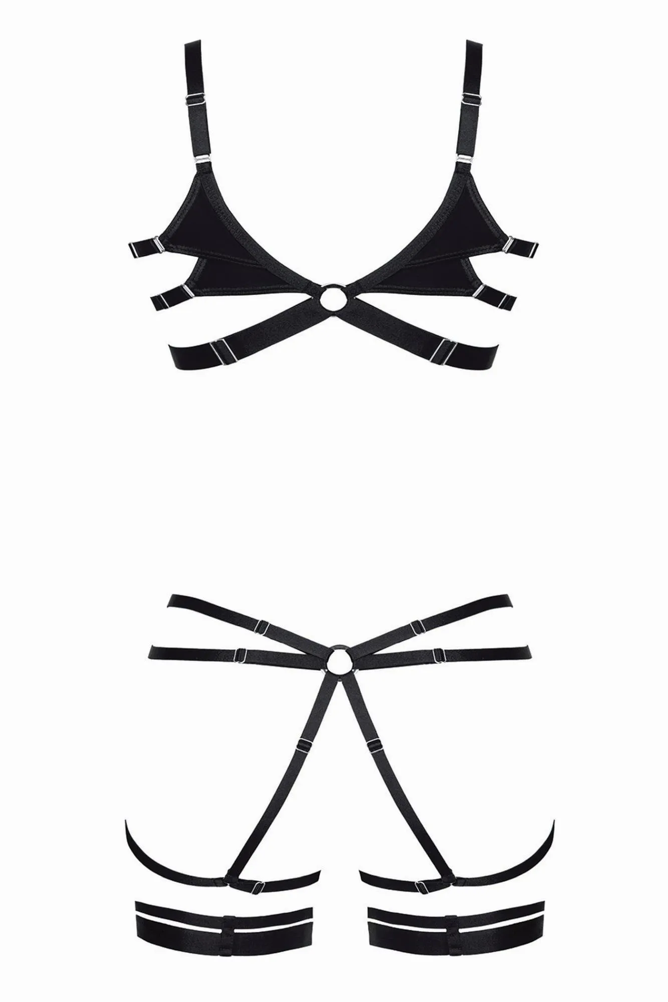 W komplecie znajdują się stringi typu open bottom, które z przodu są połączone z podwiązkami, co podkreśla seksowny charakter bielizny. Z tyłu zastosowano efektowne gumki z metalowymi regulatorami, które nie tylko stanowią element ozdobny, ale również funkcjonalny, pozwalając na swobodne dopasowanie do ciała. Całość zapakowana jest w spersonalizowane pudełko zawierające zdjęcia produktu, co czyni ten zestaw idealnym na prezent lub wyjątkową okazję.