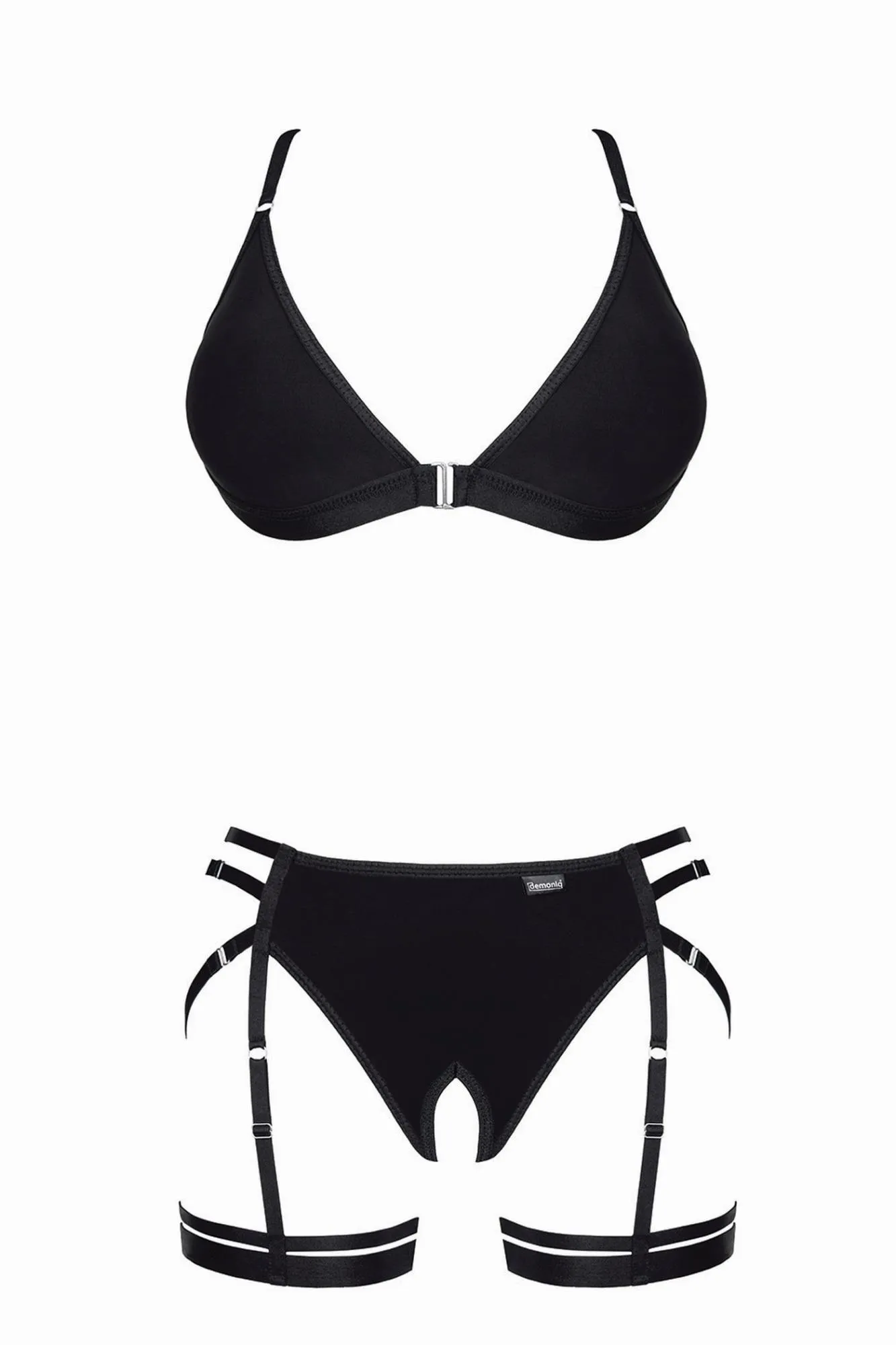 Komplet składa się z biustonosza oraz stringów typu open bottom, które łączą funkcjonalność z wytwornym designem. Biustonosz ozdobiony jest srebrnym, metalowym zapięciem z przodu oraz interesującą kompozycją gumek z regulatorami z tyłu, które umożliwiają dostosowanie do indywidualnych potrzeb. Stringi, połączone z podwiązkami z przodu, zapewniają zmysłowy wygląd, a gustowne elementy metalowe dodają całości elegancji.