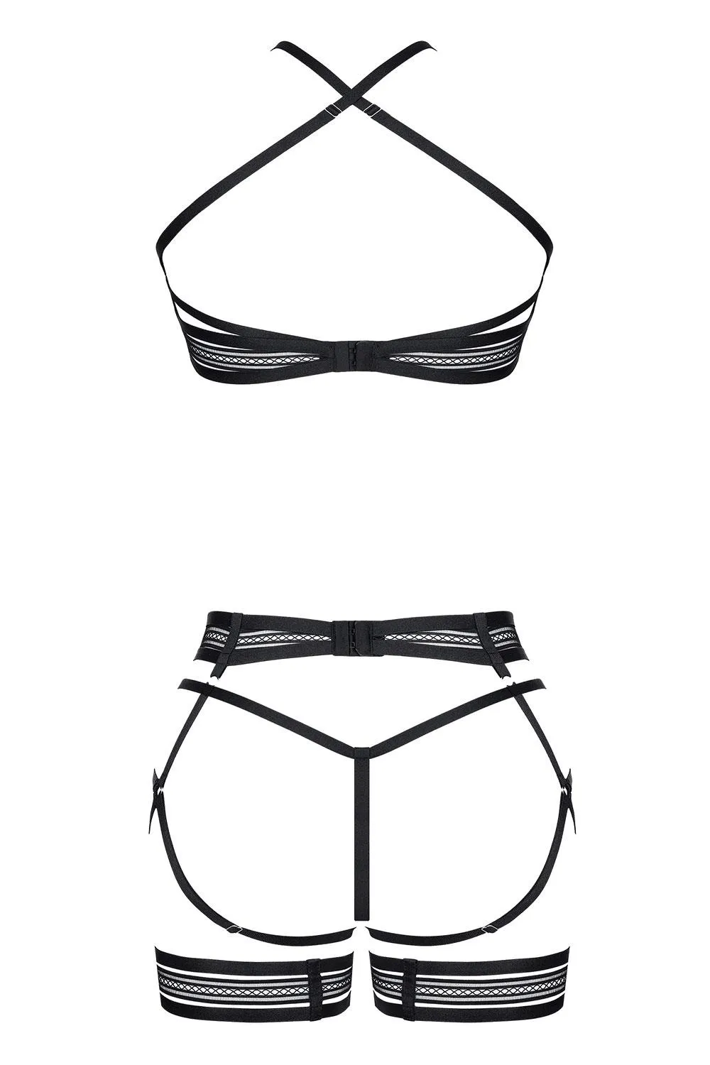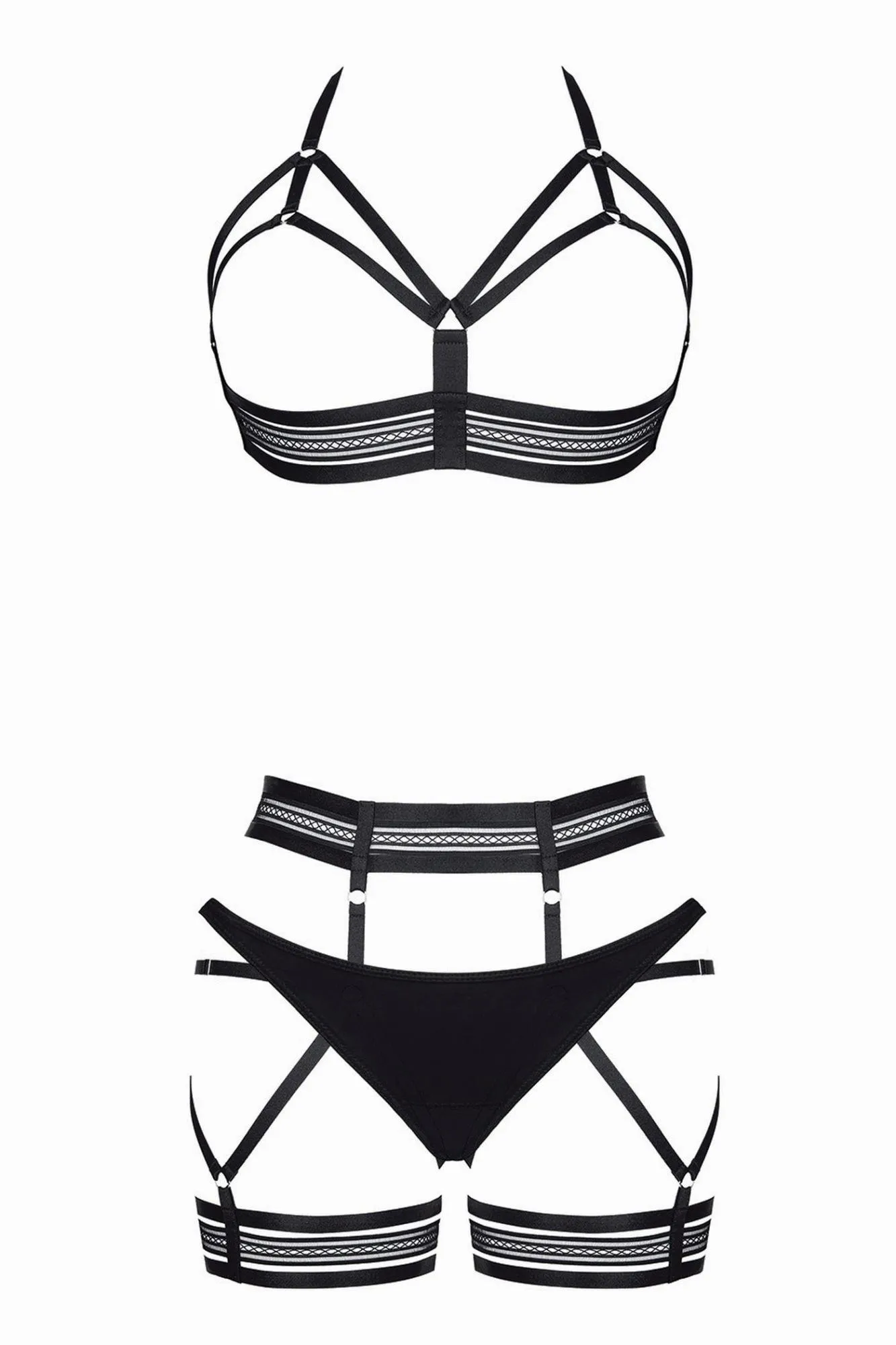 Biustonosz w komplecie charakteryzuje się efektownym otwartym przodem, który zdobi starannie wykonaną kompozycją z gumek oraz ozdobną gumką w dolnej części. Z tyłu znajduje się oryginalna dekoracja z gumek, która posiada srebrne metalowe regulatory, umożliwiające dostosowanie bielizny do preferowanej wysokości. Stringi z kolei są wykonane z przyjemnego, elastycznego materiału, który jest zarówno przyjazny dla skóry, jak i zmysłowy.