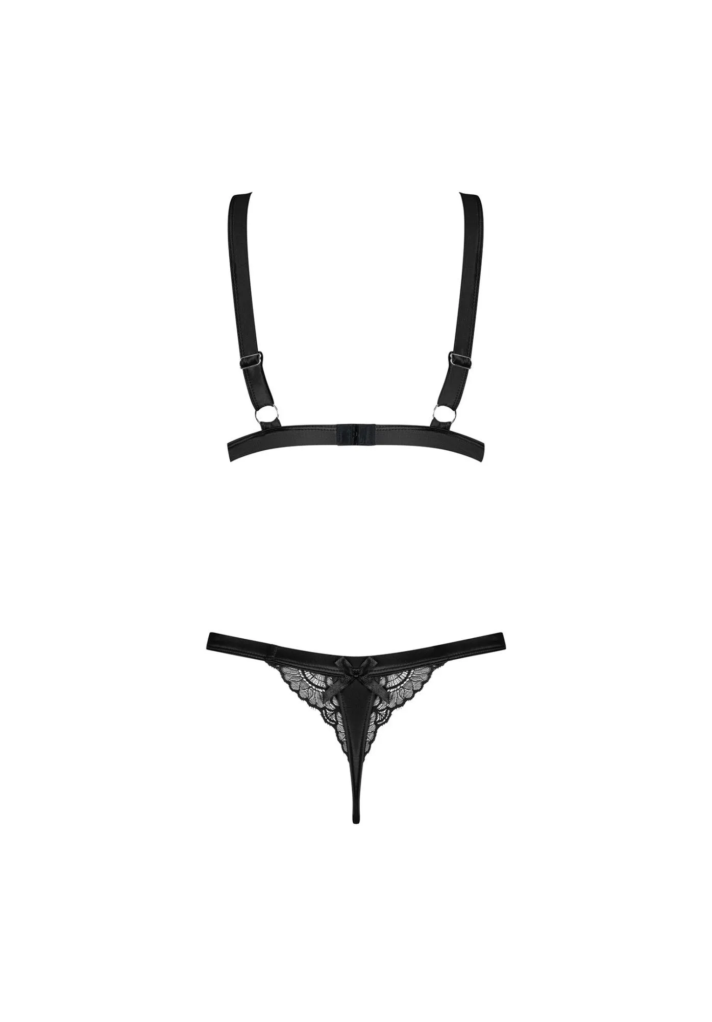 Atutem tego seta jest delikatne połączenie satyny i koronki, które dodaje mu niezwykłego charakteru. Biustonosz charakteryzuje się oryginalnym dekoltem, który subtelnie podkreśla biust, a stringi w zmysłowym kroju podkreślają kobiece atuty. Ten komplet z pewnością rozgrzeje każdą jesienną noc, a jego eleganckie zdobienia, takie jak kocie paseczki oraz niewinne kokardki, zachwycą nawet najbardziej wymagające klientki.