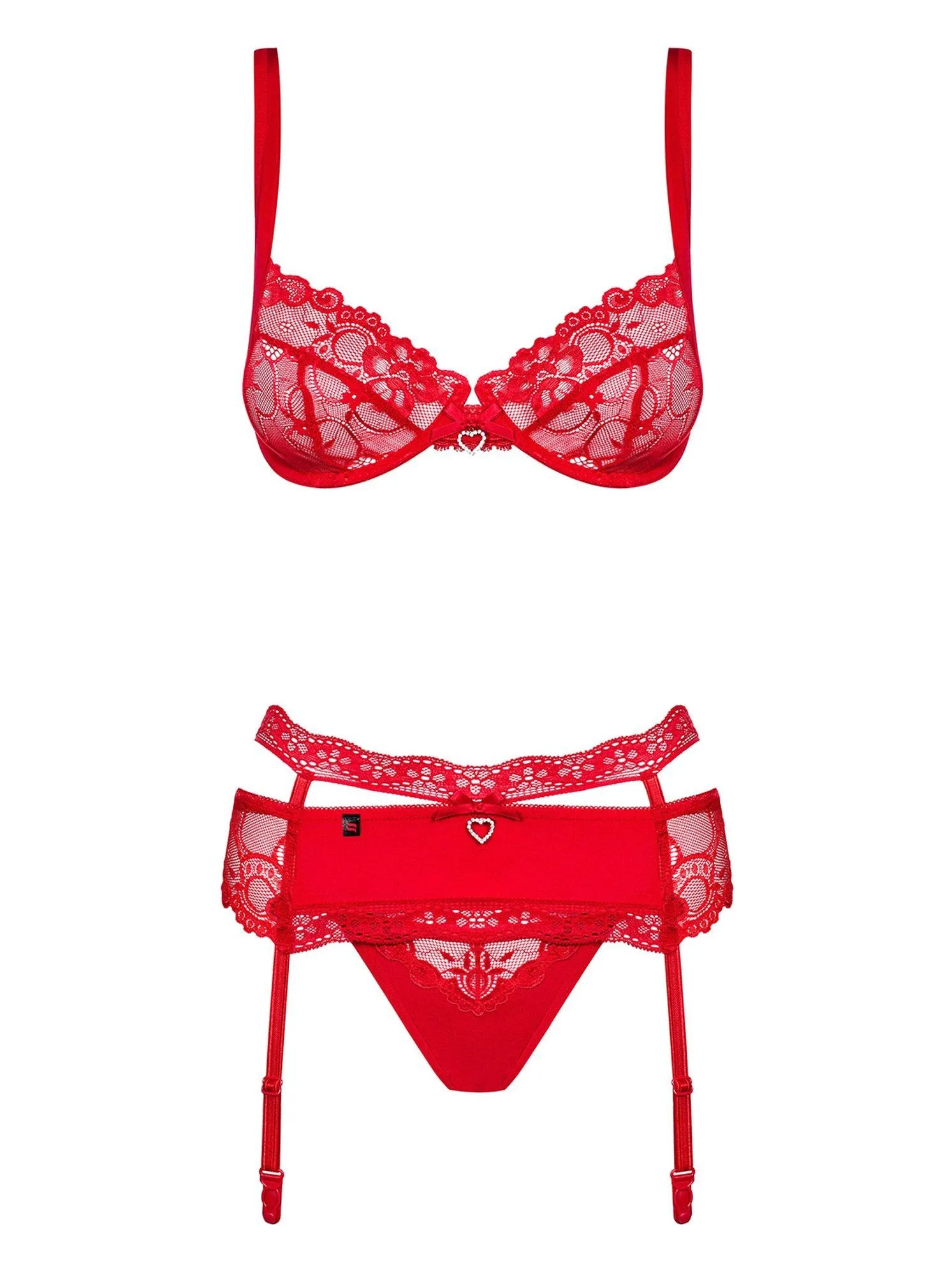 Biustonosz, uszyty z kwiatowej koronki, doskonale podkreśla biust, dzięki regulowanym ramiączkom oraz wielostopniowemu zapięciu, co zapewnia idealne dopasowanie do każdej figury. Fiszbiny w miseczkach uwydatniają krągłości, a serduszko z cyrkonii oraz delikatna kokardka między miseczkami dodają całości kobiecego uroku. Pas do pończoch, wzbogacony o dodatkowy pasek koronki i regulowane zapięcia, gwarantuje zjawiskowy wygląd oraz komfort noszenia.