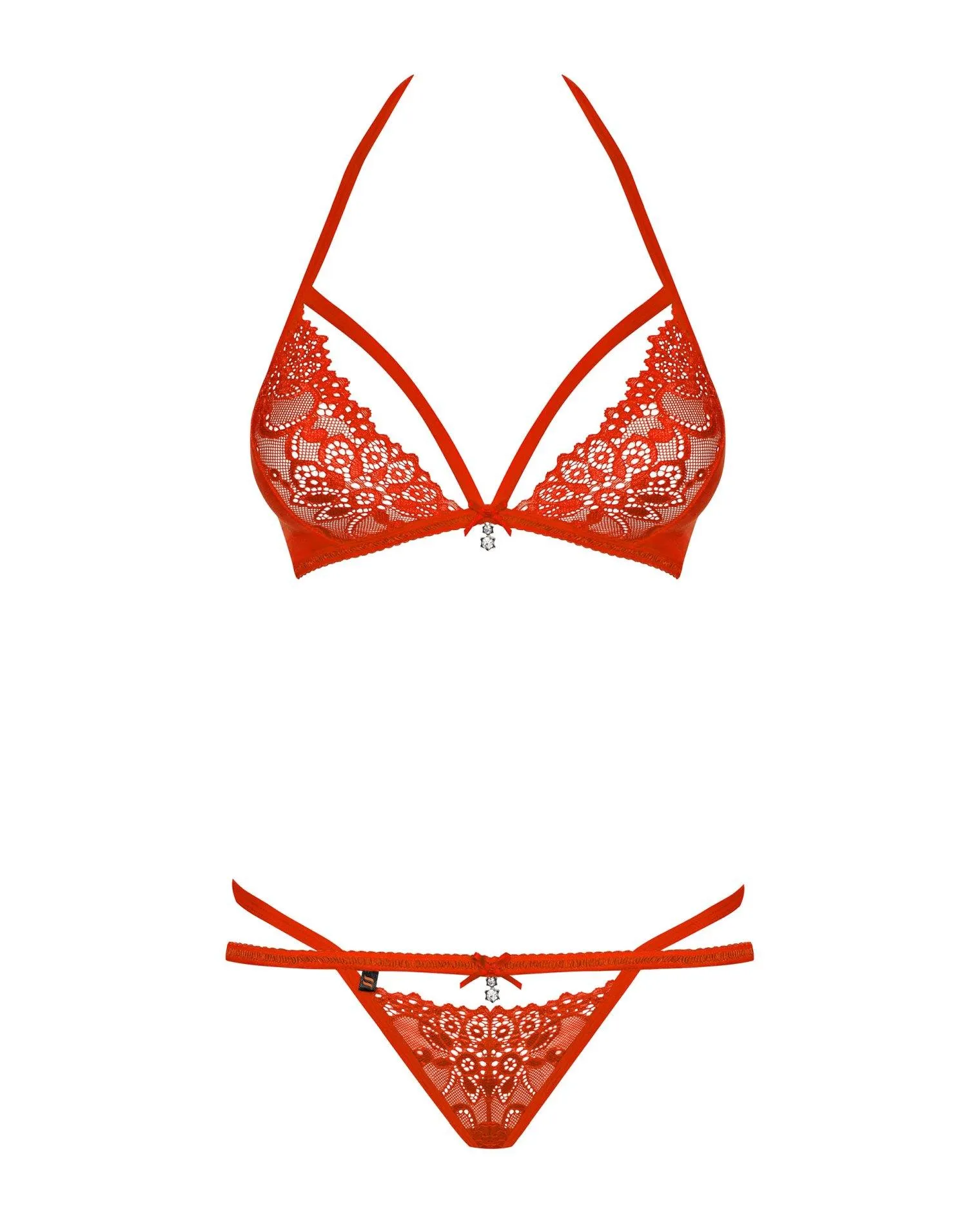 Stringi w tym komplecie są niezwykle efektowne, z podwójnymi paseczkami i intrygującym wycięciem, co sprawia, że całokształt bielizny jest jeszcze bardziej kuszący. Komplet składa się z biustonosza oraz majteczek, co czyni go doskonałym wyborem na romantyczne wieczory lub specjalne okazje. Spraw sobie lub swojej drugiej połówce niezapomniane chwile z tym niesamowicie seksownym kompletem bielizny.