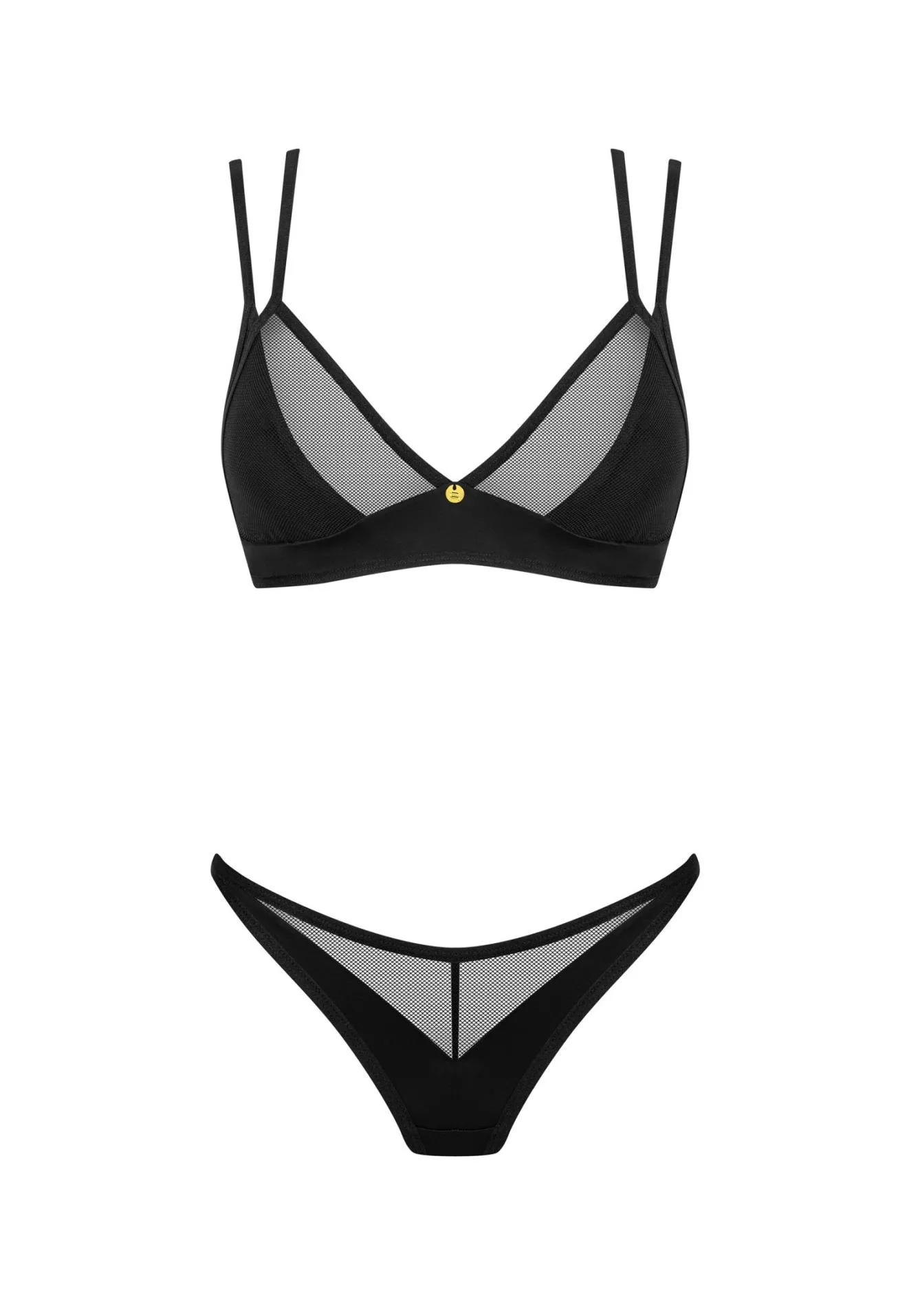 Komplet wyróżnia się zmysłowym designem, w którym połączenie jednolitej tkaniny z przezroczystą siatką nadaje mu niezwykle elegancki charakter. Klasyczna czerń bielizny doskonale wpisuje się w trendy, a jednocześnie sprawia, że niezależnie od okazji, poczujesz się atrakcyjnie i pewnie. Wyróżniającym elementem jest wygodny materiał (85% poliamid, 15% elastan), który jest nie tylko przyjemny w dotyku, ale także zapewnia pełną swobodę ruchów.