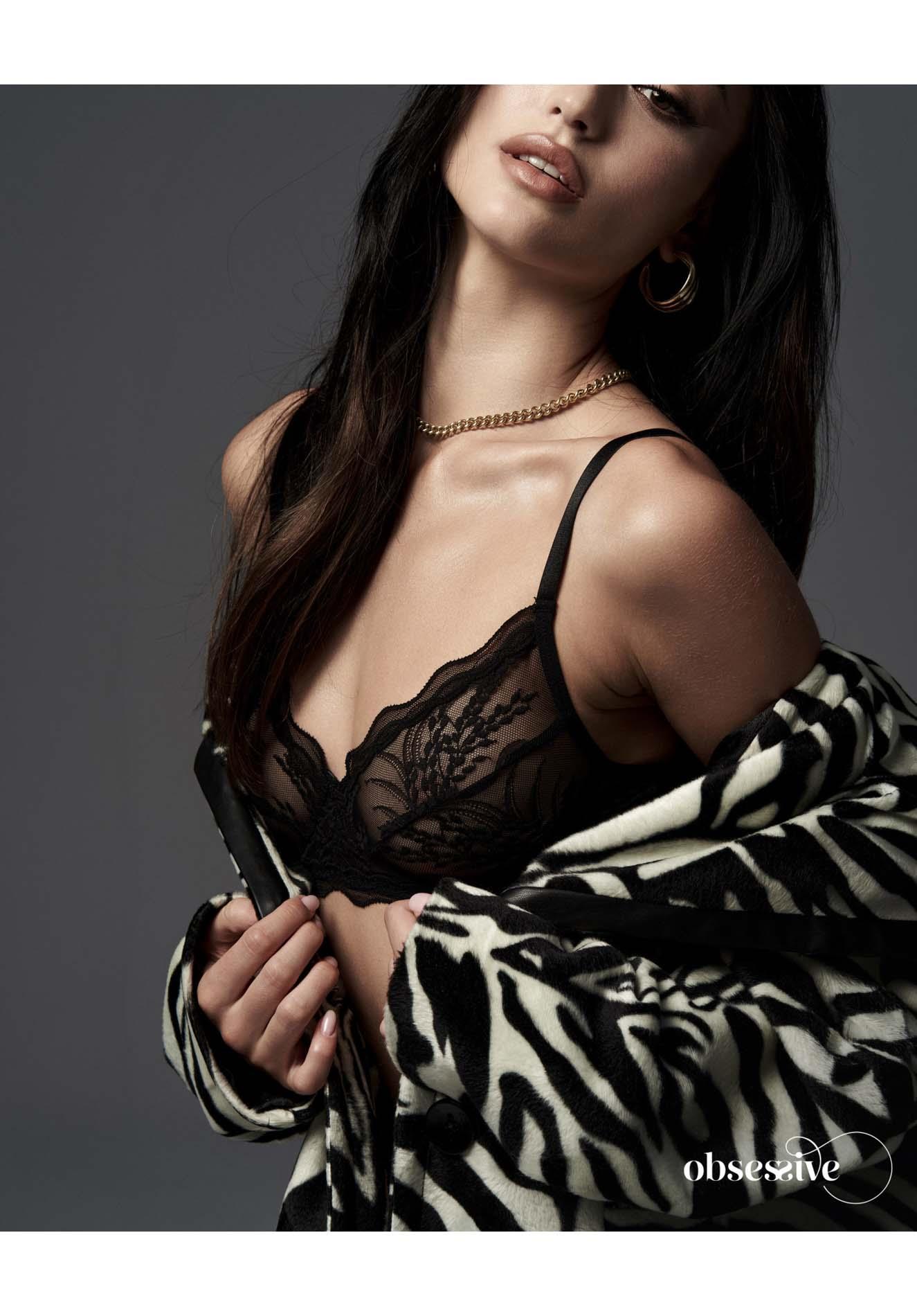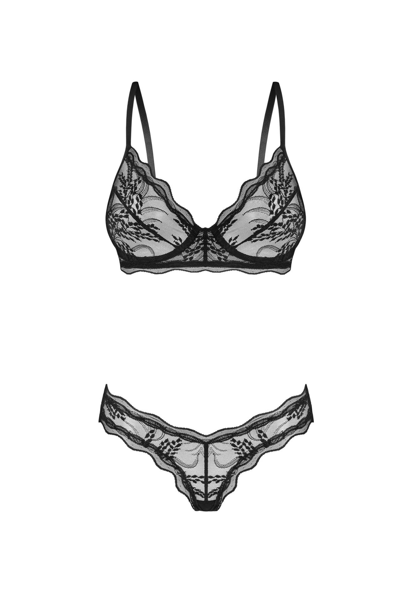 Biustonosz posiada miseczki z fiszbinami, które subtelnie podkreślają biust oraz gwarantują stabilne podparcie. Dodatkowo kompletnie wyposażono go w regulowane ramiączka i kilkustopniowe zapięcie, co umożliwia precyzyjne dopasowanie do sylwetki. Transparentne elementy z ozdobnym motywem nadają zestawowi zmysłowego i wyrafinowanego charakteru, jednocześnie podkreślając minimalistyczny design.