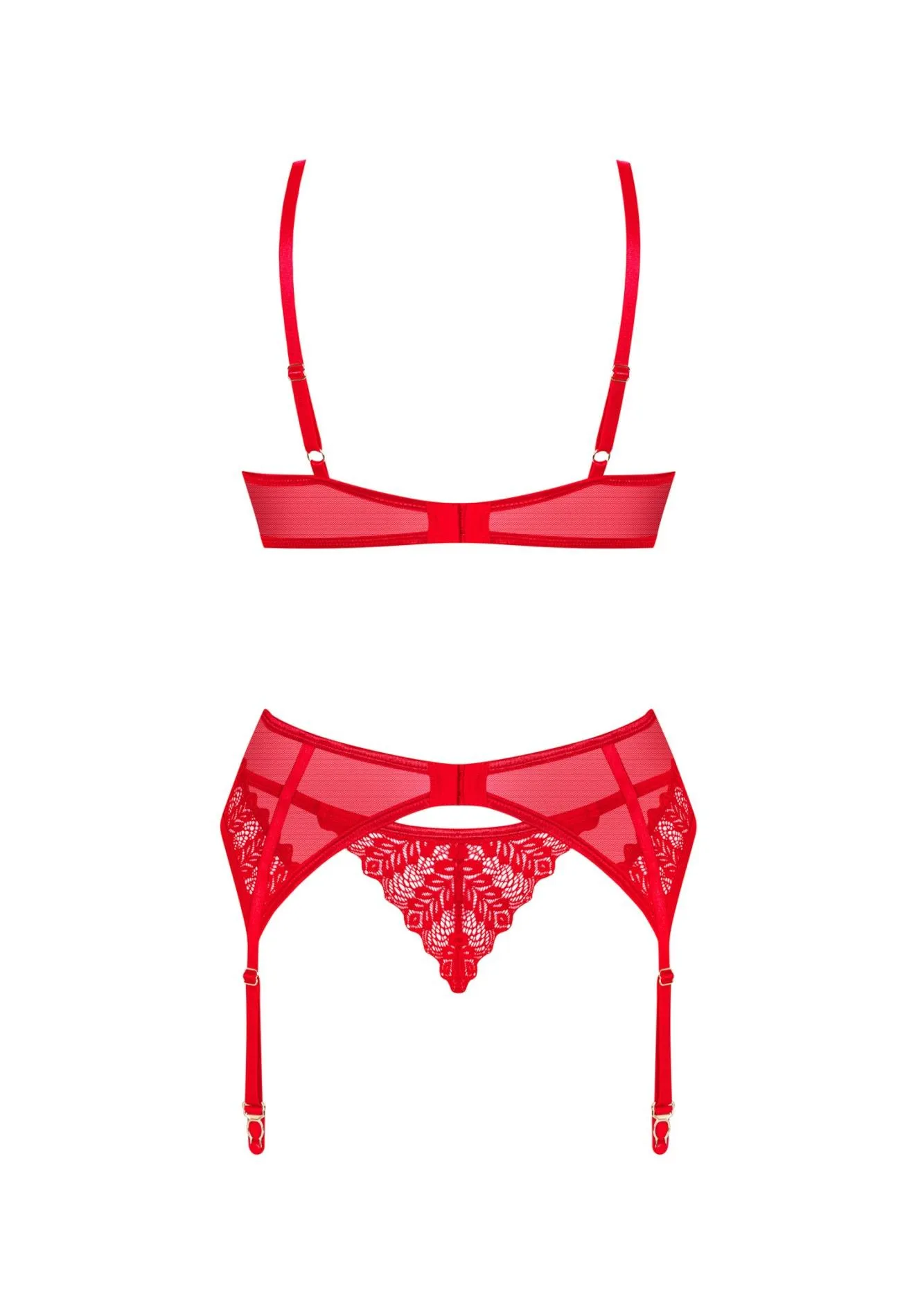 Przedstawiamy komplet bielizny Ingridia, który z pewnością przyciągnie uwagę i dostarczy niezwykłych wrażeń. W skład zestawu wchodzą biustonosz, pas do pończoch oraz stringi w pięknym odcieniu czerwonowym. Dzięki niebanalnemu designowi oraz intrygującym detalom, stworzysz zmysłowy look, który zachwyci nie tylko Ciebie, ale i Twojego partnera.